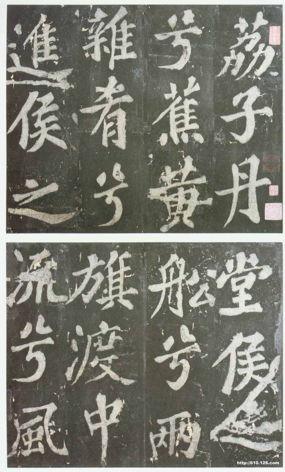 《罗池庙碑》即《罗池庙迎享送神诗碑》,或称《罗池铭辞》、《荔子丹碑》等,以苏轼的真迹刻石而成,刻于南宋嘉定十年(1217),正书,十行,行十六字,无书写年月。唐韩愈曾作《罗池庙碑》,沈传师书,其碑久佚。苏轼书韩文中的迎享送神诗,后精工摹刻于石上,石在广西马平罗池庙。在用笔上虽仍是三分笔,但温厚中出险辣,得气得势。比如其中一些“我”字,“戈”法不取钩,而是一泻而下;“事”、“兮”等字末尾均以铦利之锋芒挟裹而出。结字上也率性而作,如“鹅”字特大,且用行书,众多“兮”字,也随手妙变。王世贞也有评:“东坡书《罗池铭辞》遒劲古雅,为其书中第一。”侯镜昶认为:“《罗池庙碑》用笔险劲,此刻更具法度,但兼有气势,与唐碑各家调然相异。东坡善于发展变化,融势入碑,开宋书特有之风。苏碑又以帖的布白,融入碑中。……自东坡倡导,宋代碑刻形成了独特的风格。”(《论苏黄米书艺》)