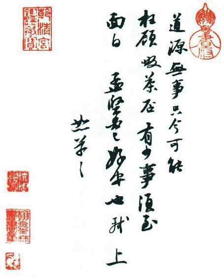 苏轼《啜茶帖》,行书,藏台湾故宫博物院。曾编入《苏氏一门十一帖》。内容是通音问,谈啜茶,说起居,落笔如漫不经心,而整体布白自然错落,丰秀雅逸。