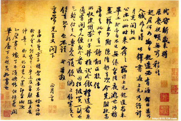 中国传统文人极重信礼之书艺,尤以魏晋人为最。苏轼崇尚晋韵,也倾心于此。岳珂《宝真斋法书赞》曾述苏轼若对所书信札不满意,会再写一遍,可见其用心。苏轼的尺牍书艺赢得了后人的推许,王履道认为“至于尺牍狎书,姿态横生,不矜而妍,不束而严,不轶而豪,萧散容与,霏霏如甘雨之霖,森竦掩映,熠熠如从月之星,纡徐宛转,纚纚如萦茧之丝,恐学者所未至也。” 苏轼的《答谢民师论文帖》后有明陈继儒题跋:“东坡碑版照四裔,不如尺牍天真烂漫。所谓“吾写字觉元气十指间拂拂飞出’,此卷等是也。”陈氏又一次指出苏轼尺牍书艺的特色,比之碑版更为“天真烂熳”。由于在不同时期给不同对象写信,书艺风格也有不同。如果按时间排列,其风格大致由流丽而至老辣,由绚烂而归平淡。