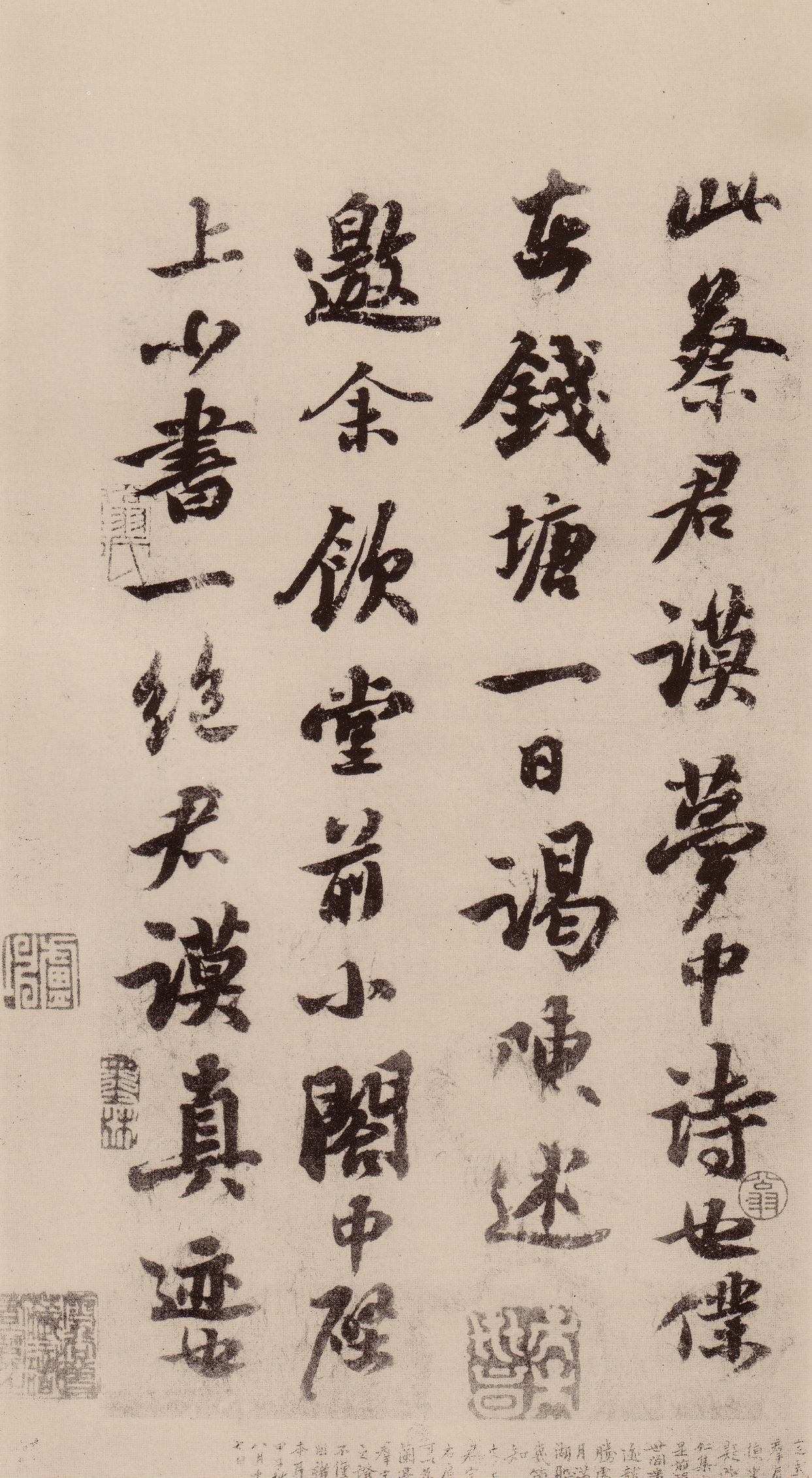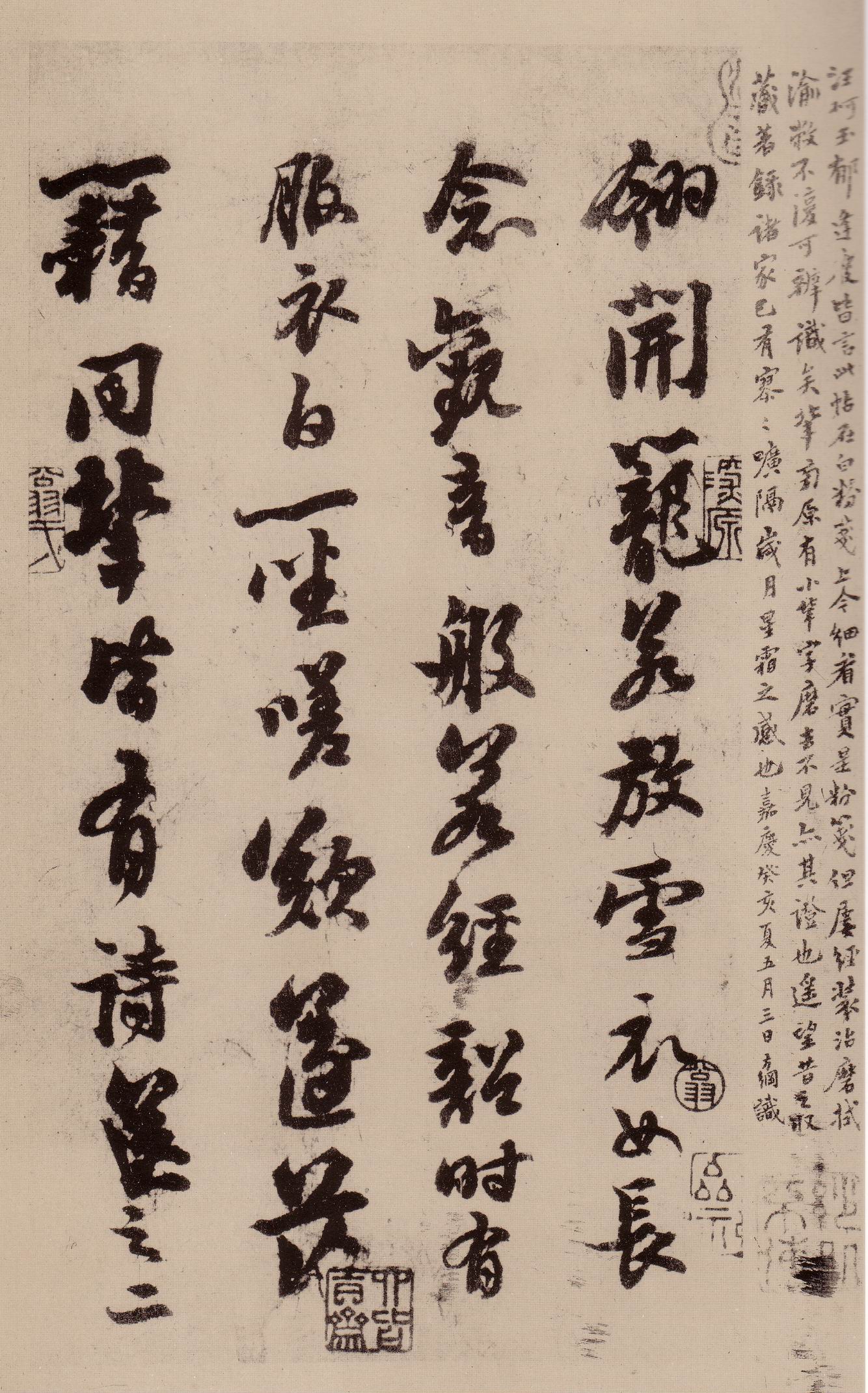 翁氏收藏此帖后,又引起了是否钧填本的争论。因存世苏书钩填本很多,而此帖纸质擦损严重,“有二一描失处”,故疑之。但翁氏肯定说这是真迹本,并将此帖与《快雪堂帖》刻本逐一比较,而断定《快雪堂帖》刻本所据乃为董其昌记载所见之摹本。在没有寻找到更多的证据前,我们尊重翁氏之论,也是有道理的。