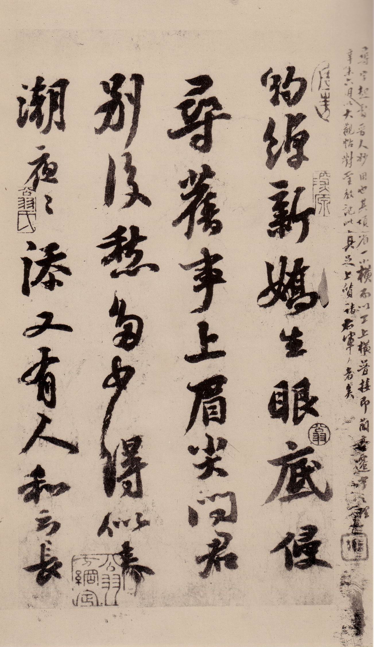 仆在钱塘,一日谒陈述(古),邀余饮堂前小合中。壁上小书一绝,君谟真迹也。“绰约新娇生眼底,侵寻旧事上眉尖。问君别后愁多少,得似春潮夜夜添。”又有人和云:“长垂玉筋残妆脸,肯为金钗露指尖。万斛闲愁何日尽,一分真态更难添。”二诗皆可观,后诗不知谁作也。