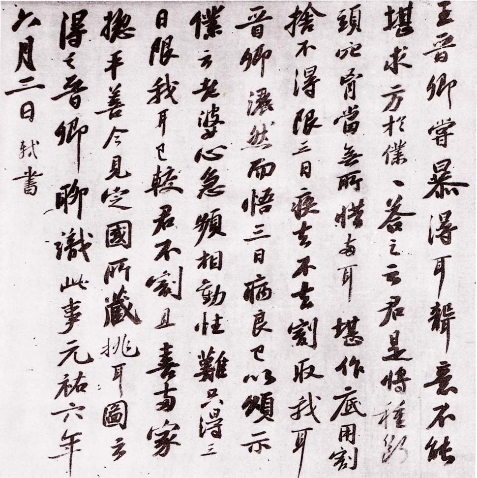 释文:王晋卿尝暴得耳聋,意不能堪,求方于仆。仆答之云:“君是将种,断头穴骨当无所惜,两耳堪作底用,割舍不得?限三日疾去,不去割取我耳!”晋卿洒然而悟,三日病良已。以颂示仆云:“老婆心急频相动,性难只得三日限。我耳已较君不割,且喜两家总平善。”今见定国所藏《挑耳图》,云得之晋卿,聊识此事。元祐六年六月二日,轼书。