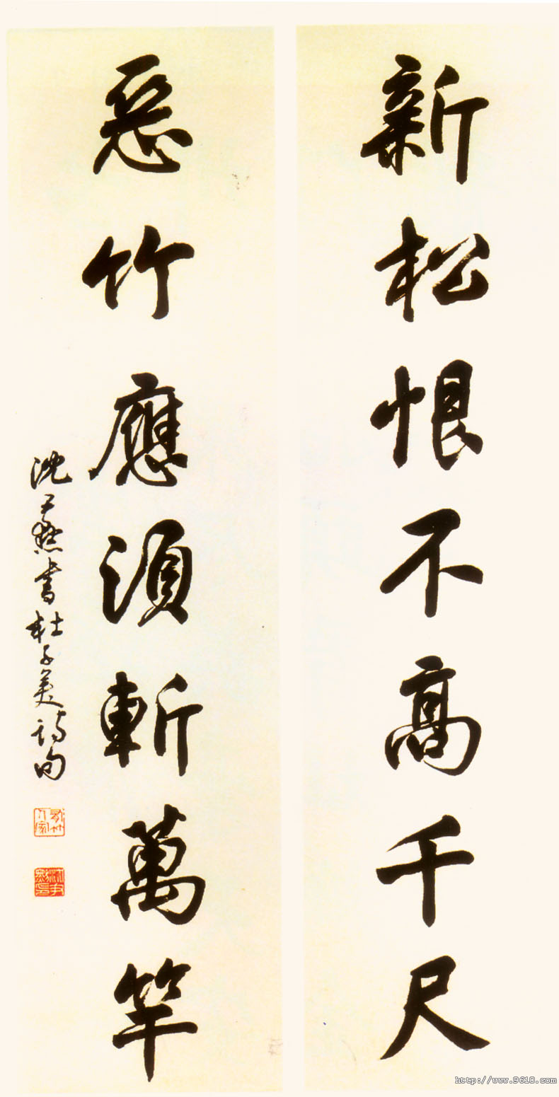 释文:新松恨不高千尺 恶竹应须斩万竿 此件行书于清圆秀润中见劲健道逸之姿。下联署款:“沈尹默书杜子美诗句”,下钤朱文方印“有竹人家”、白文方印“沈尹默印”二枚。 【资料来源】南京博物院网站