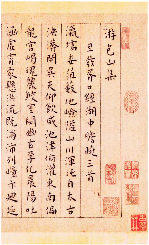 1520年,王宠游昆陵包山,曾任游诗数首,结为《包山集》。1526年冬,王宠过鸿溪宿友人补菴居士处,居士几他索书。第二年(1527年),他便将八年前游包山所作的游诗用小楷抄录了二十二首寄给了补菴居士。他的朋友文嘉在居士处见到这卷小楷后,称之为“天才妙绝”。后人普遍认为《游包山集》是王宠的小楷代表作,然刘九庵先生认为此作或非王宠所作,即便如此,此卷楷书运笔精到,字形大小参差有致,古拙中自得妍巧,气韵超逸,婉丽遒媚,不失为小楷临习的优秀范本。宋苏轼曾说:“大字难于结密而无间,小字难于宽绰而有余。”王氏这卷《游包山集》,其结体“宽绰而有余”,其书风旷适疏宕,遒媚飘逸,谓上乘之作言而不虚。