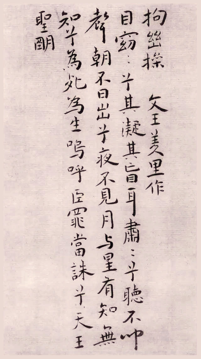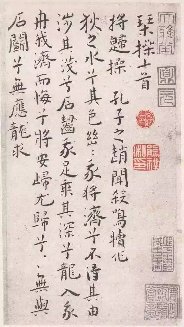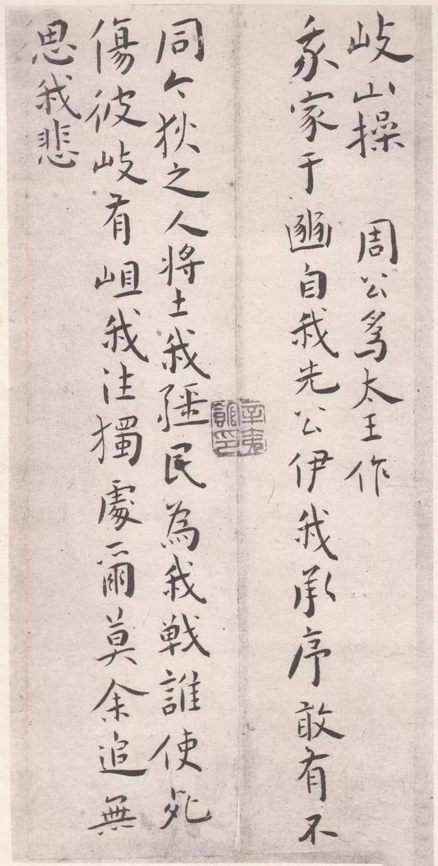 王宠的这本小楷册录孔子、周公《龟山操》、《岐山操》等共十首,书于嘉靖乙酉(1525年),时年32岁。王宠于十月朔日用金栗山藏经纸书写,内容为韩愈作仿古《琴操》曲十首,此迹落款「乙酉十月朔,书于石湖竹下,雅宜山人王宠」,钤「王履吉印」、「韡韡斋」二印。