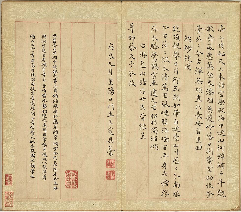 款署:右游包山諸作廿五首錄呈尊師蔡夫子斧政。庚辰(西元一五二0年)九月重陽日門生王寵具藁。