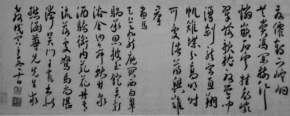 [30] 如正德十二年丁丑(1517)仲夏廿日,行草《浔阳歌、楞伽吊古诗》,北京故宫博物院藏;正德十三年戊寅(1518)春三月,行草题文徵明《惠山茶会图》,上海博物馆藏;正德戊寅(1518)季冬十日,草书《送孙太初卜隐苕溪等十首》,上海博物馆藏。