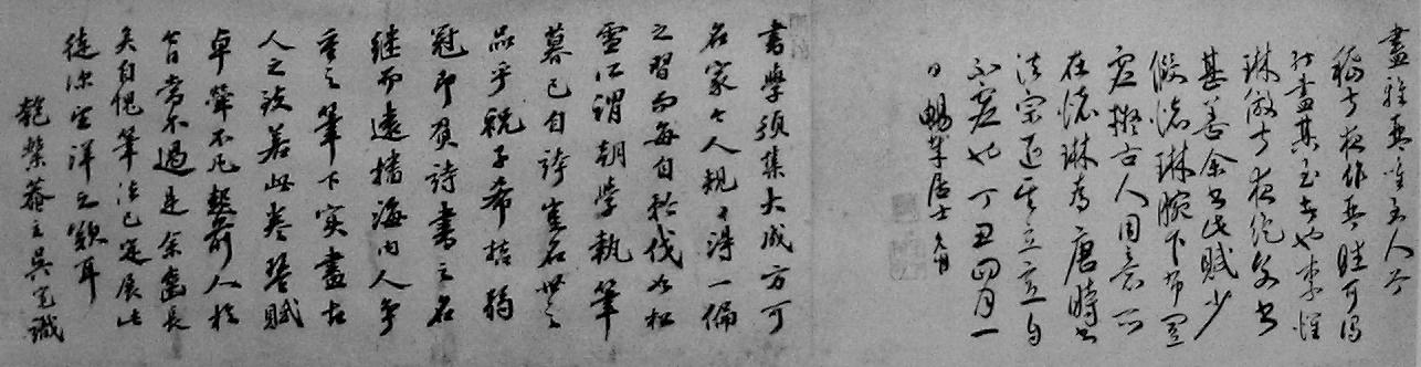 《曹子建诗册》虽无系年,但与祝允明正德丁丑(1517)年四月一日所书《琴赋》用笔运意颇为相近,且款识章草亦祝氏所习书。[27]《琴赋》拖尾有吴宽跋一则,对于祝氏“笔下尽古人之致”羡慕不已,但自己年老而笔法已定,只能兴望洋之叹。祝允明在识语中谈到此时对唐人李怀琳的取法,他说:“嵇叔夜作《琴赋》,可谓能尽其至者也。李怀琳仿叔夜《绝交书》,甚善,余书此赋少假怀琳腕下布置,虚拟古人用意所在。怀琳为唐时书法宗匠,其立意自不虚也。”【图1】《绝交书》,唐人就下了断语,是一件伪迹,而且俗态尤多, [28]但祝允明却将李怀琳称为“书法宗匠”。