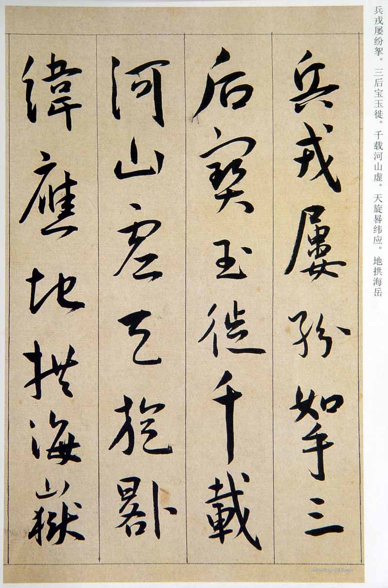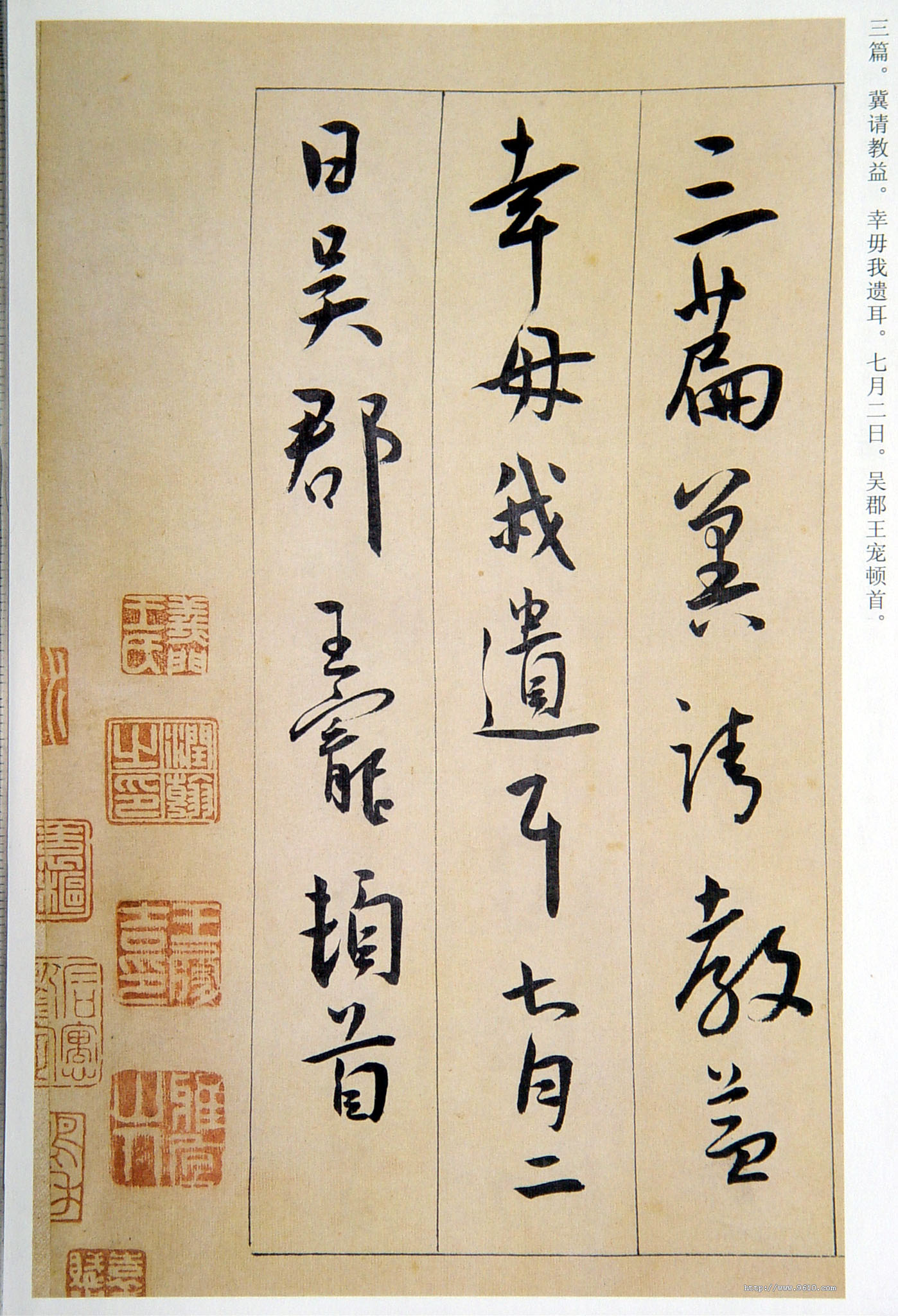 该卷《西苑诗》,取法献之、虞世南笔意,但善于掺拙,做到了巧而不媚,流畅而不浮滑;用笔清劲秀雅,温润含蓄,不激不厉,技巧动作的表达非常细腻、精巧,变化极其微妙;结体安排精巧流走,法度、情性俱在,有些地方还流露章草遗韵,更显高古蕴藉;整个气息落拓不羁、遒劲萧疏,在沉静、收敛之中反而更具一种内在的张力。诚如清黎惟敬所赞颂的那样:“晋人真迹,世所罕见。所传者,仿书耳。诸体混淆,若出一手,不辨其为谁也。近世吴人王履古氏独能追踪大令,萧散俊逸,复出流辈,虽不见晋人书,知其为绝艺也。”