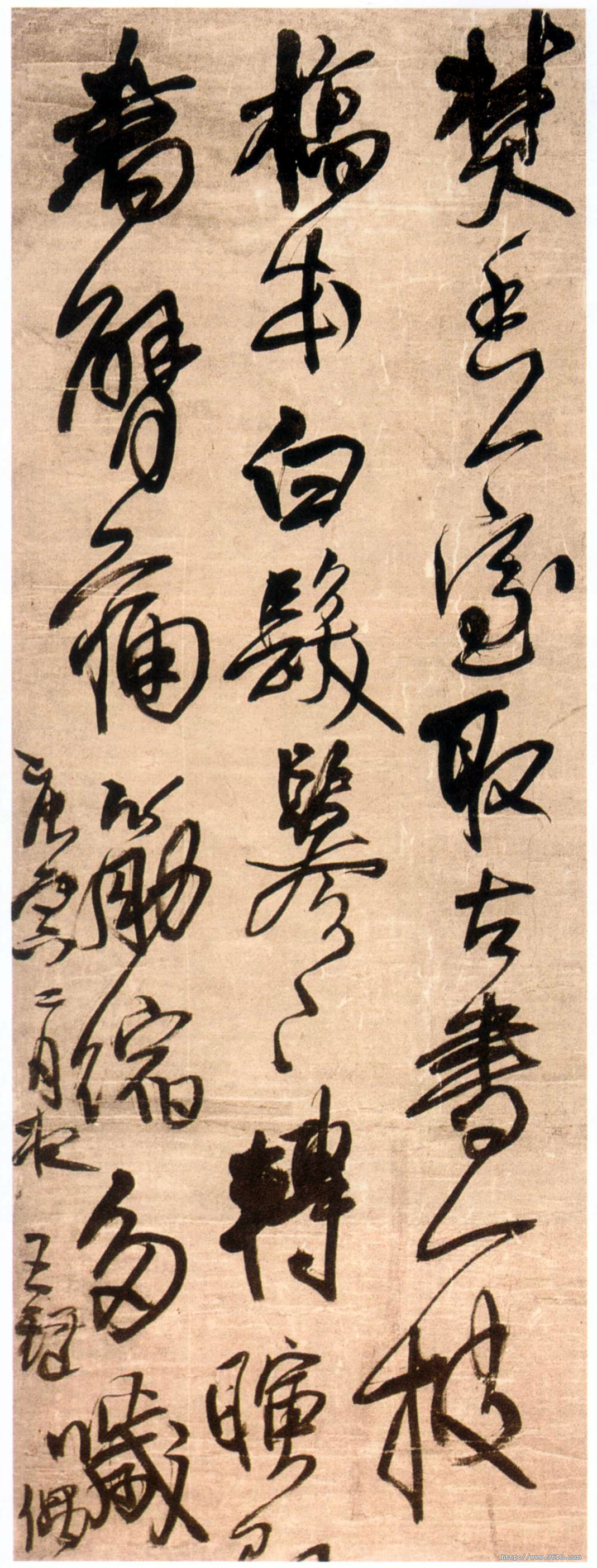 王铎《书画虽遣怀文语轴》(下图为局部)自署书于庚寅年(清顺治七年,1650年)五十九岁作,行书绢本,文语一则。凡五行,共70字。纵203cm,横50cm。首都博物馆藏。