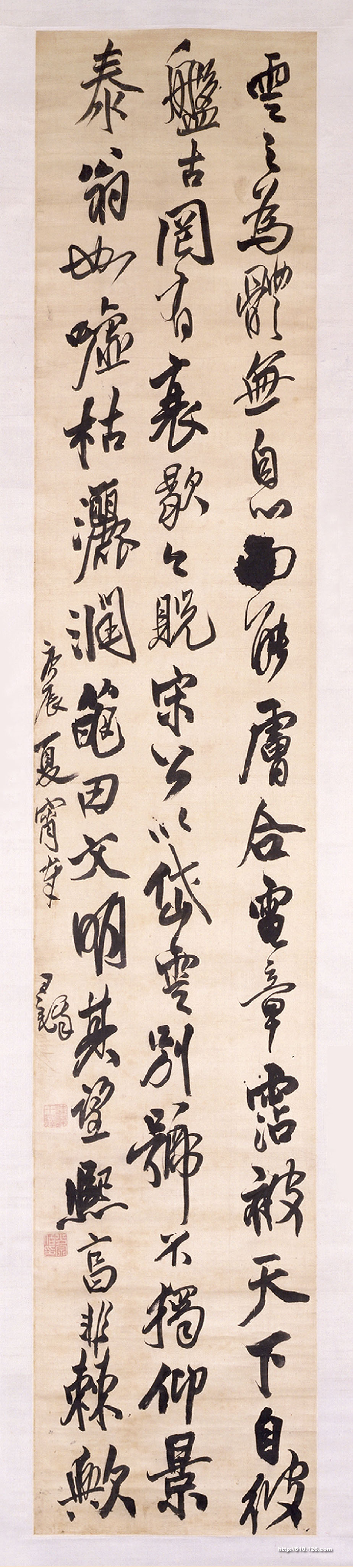 此轴录语一段,末款“庚辰夏宵奉,王铎。”下钤“崝嵘王铎”、“大宗伯印”。无鉴藏印。从题款可知此轴作于明崇祯十三年(1640年),王铎时年48岁。此轴题款处距边缘很近,且题款形式也似有不尽合理之处,故推测上款可能已为人裁去。王铎此轴作于明末,受字人或与明廷有关,并在清初属于不容于清政权之人,因此收藏者将上款剜去,现在也就难考其人了。