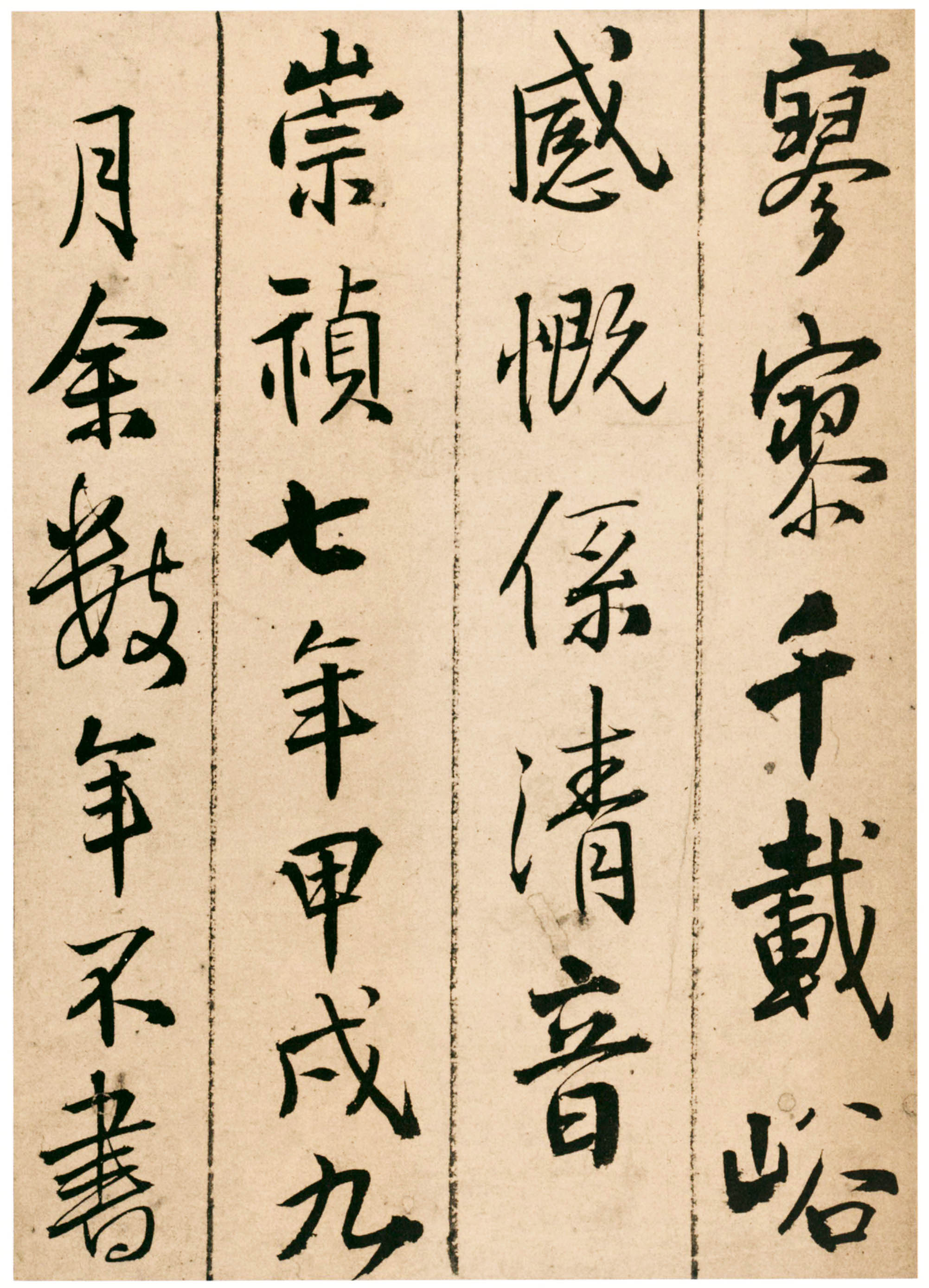 款识:崇祯七年甲戌九月,余数年不书真行,灯下为之,不审双钩刻石可不?