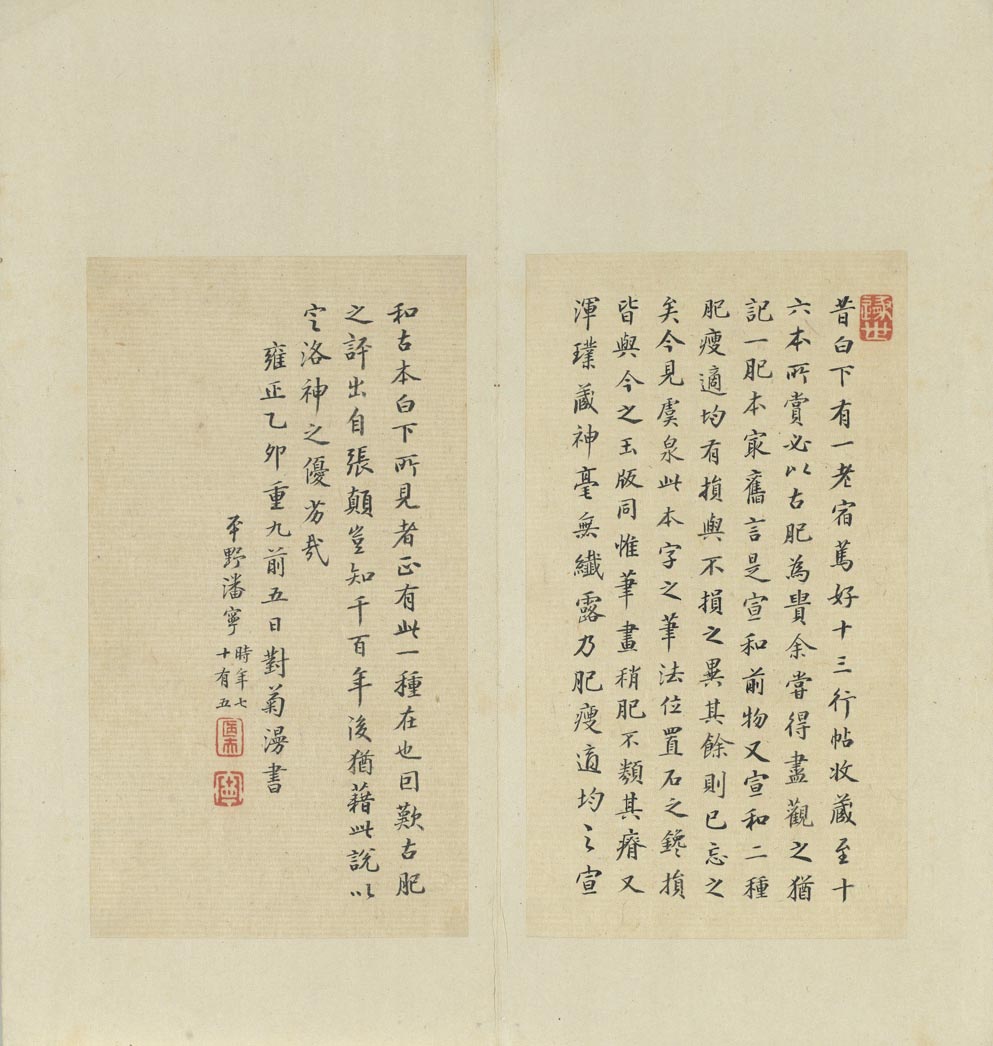 清 潘宁跋:昔白下有一老宿。篤好十三行帖。收藏至十六本。所賞必以古肥為貴。余嘗得盡觀之。猶記一肥本最舊。言是宣和前物。又宣和二種。肥瘦適均。有損與不損之異。其餘則已忘之矣。今見虞泉此本。字之筆法位置。石之鑱損。皆與今之玉版同。惟筆畫稍肥。不類其瘠。又渾璞藏神。毫無纖露。乃肥瘦適均之宣和古本。白下所見者。正有此一種在也。因歎古肥之評。出自張顛。豈知千百年後。猶藉此說以定洛神之優劣哉。雍正乙卯(西元一七三五年)重九前五日。對菊漫書。平野潘寧。時年七十有五。