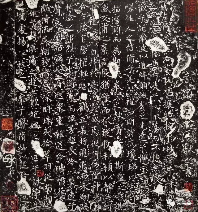 明代万历年间,其中的《洛神赋十三行》一石被人携到杭州,以贾似道旧刻的名义出售,更附会出“碧玉版”“篙痕”的传说,使这件宋代帖石罩上重重迷雾。事实上,这只是一件王献之《洛神赋十三行》的宋代翻刻本,并非真迹上石,再加上后人加以打磨和剔剜,早已仅存形骸,无复晋韵,无怪乎杨守敬在《学书迩言》中认为:“不似晋人之笔!”17而《宝晋斋法帖》中的《洛神赋十三行》应是《玉版十三行》真正的宋拓。