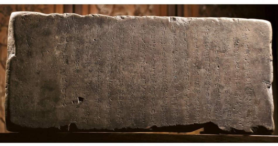 《玉版十三行》原石,长295毫米,宽270毫米,厚12毫米,石质细润,为青黑色河南石,并非碧玉,现藏首都博物馆。(图9)