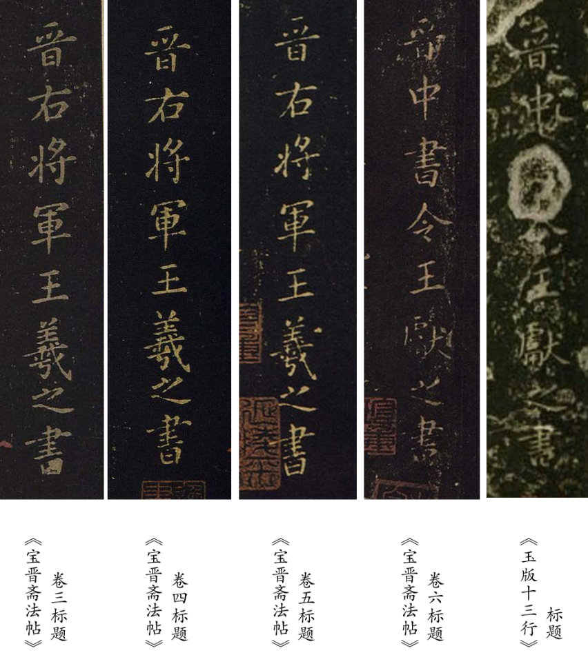 在《洛神赋十三行》的各个版本中,《玉版十三行》与《宝晋斋法帖》最为接近,无论是字形结构还是章法位置都极其接近,尤其前端的“晋中书令王献之书”楷书标题,两者如出一手。