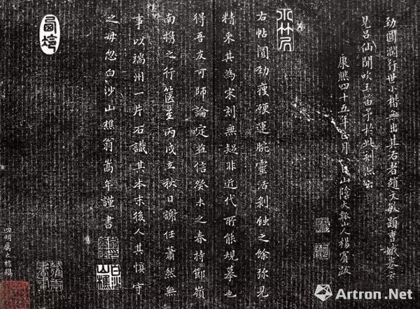 由此可知,《玉版十三行》在杭州发现后,先归泰和令陆梦鹤,后迭经观桥叶氏、王耳溪收藏,后翁嵩年于康熙四十二年(1703)以三百两银子从王耳溪处购得,后赠拓本请杨宾考其源流,跋于其后。翁嵩年在岭南任学使期间,以端石刻杨宾跋及自跋(四明厉大标刻,翁嵩年自跋收录于《观妙斋藏金石文考略》),附于《玉版十三行》之后(图8),并使此《玉版十三行》渐行于世。康熙四十五年(1706)翁嵩年学使差竣回京,将其贡入内府。