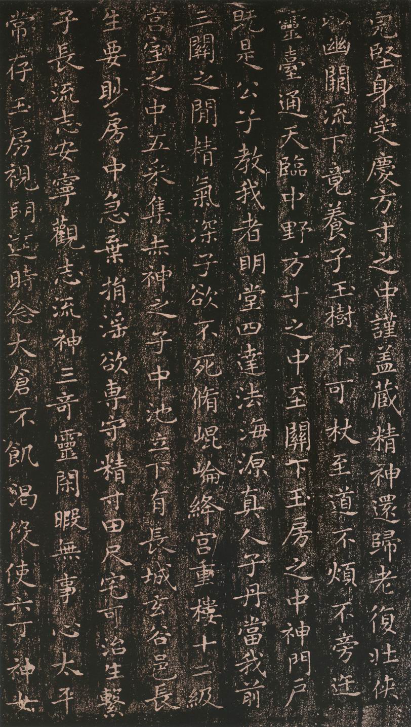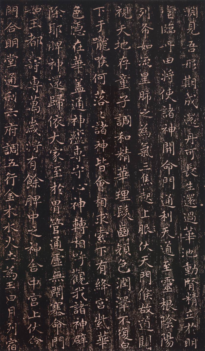 《黄庭经》,王羲之书,小楷,一百行。原本为黄素绢本,在宋代曾摹刻上石,有拓本流传。此帖其法极严,其气亦逸,有秀美开朗之意态。关于黄庭经,有一段传说:山阴有一道士,欲得王羲之书法,因知其爱鹅成癖,所以特地准备了一笼又肥又大的白鹅,作为写经的报酬。王羲之见鹅欣然为道士写了半天的经文,高兴地“笼鹅而归”。原文载于南朝《论书表》,文中叙说王羲之所书为《道》、《德》之经,后因传之再三,就变成了《黄庭经》了。