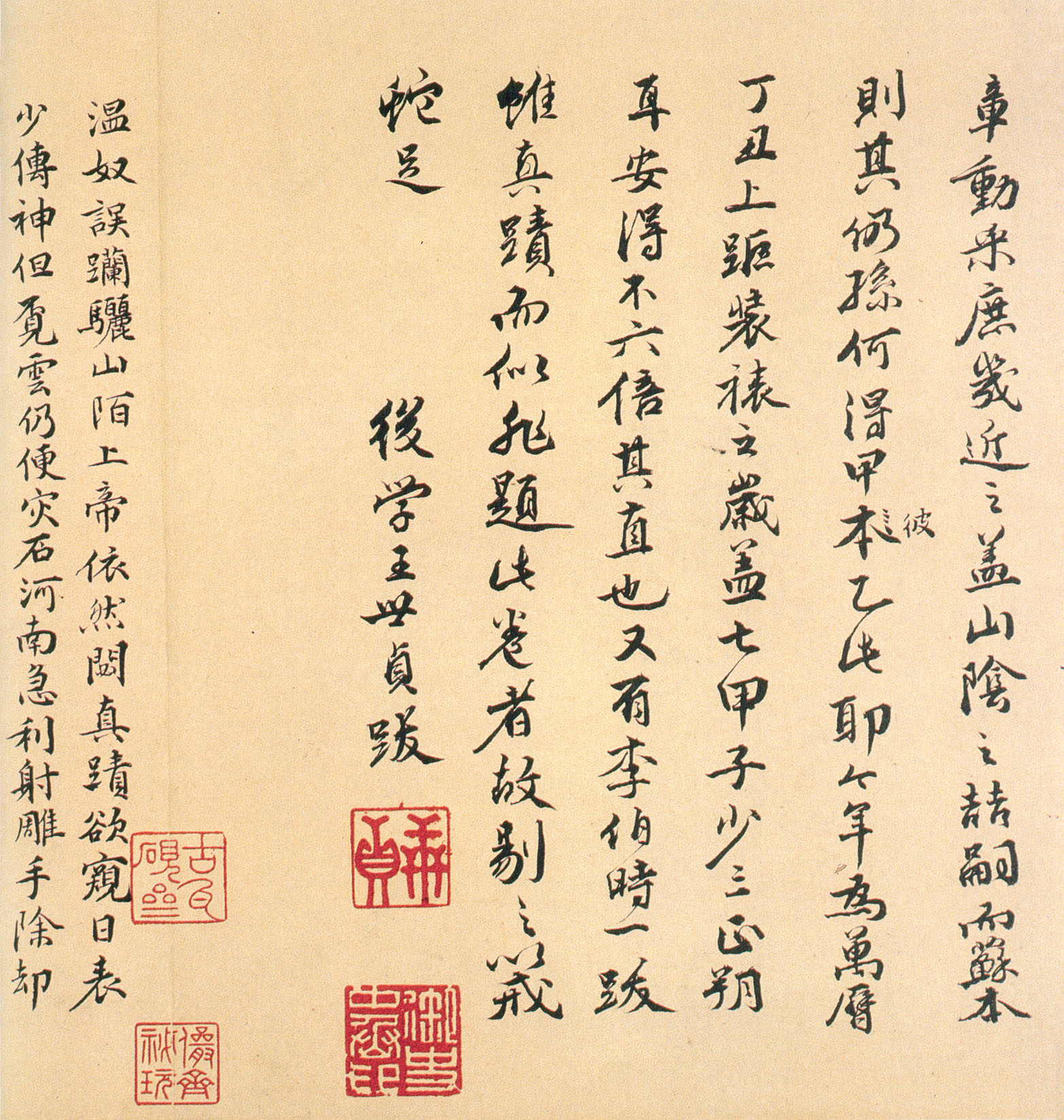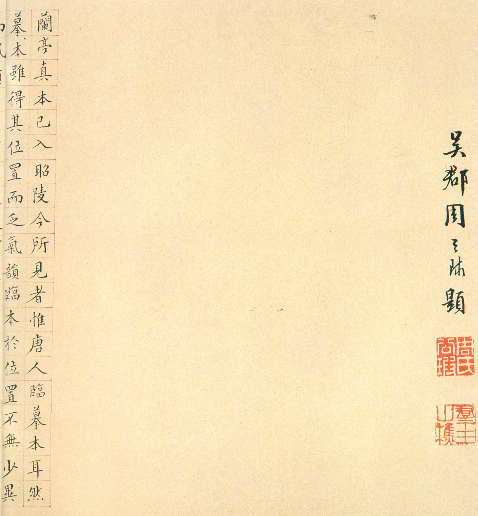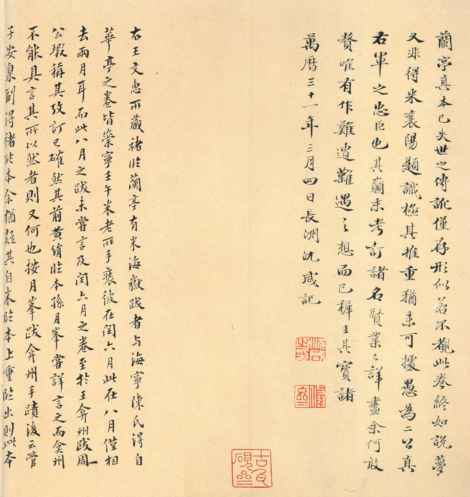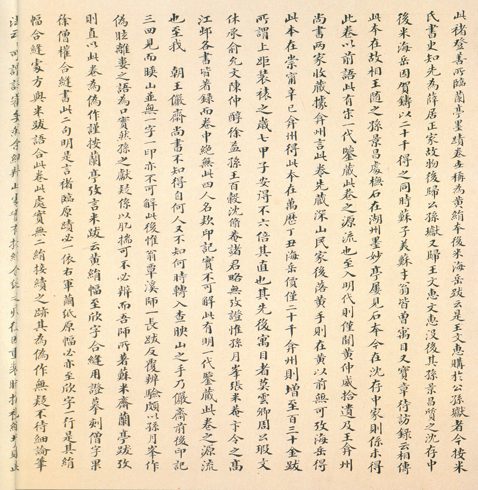 褚遂良摹《兰亭序》(黄绢本)拖尾 莫是龙[8][9][10]王世贞[11][12][13][14][15]周天球[16][17]文嘉[18][19]俞允文、陈仲醇、徐益孙[20]王穉登[21]沈咸[22]翁方纲[23][24][25]梁章钜[26][27]日本人内藤虎[28][29][30][31]