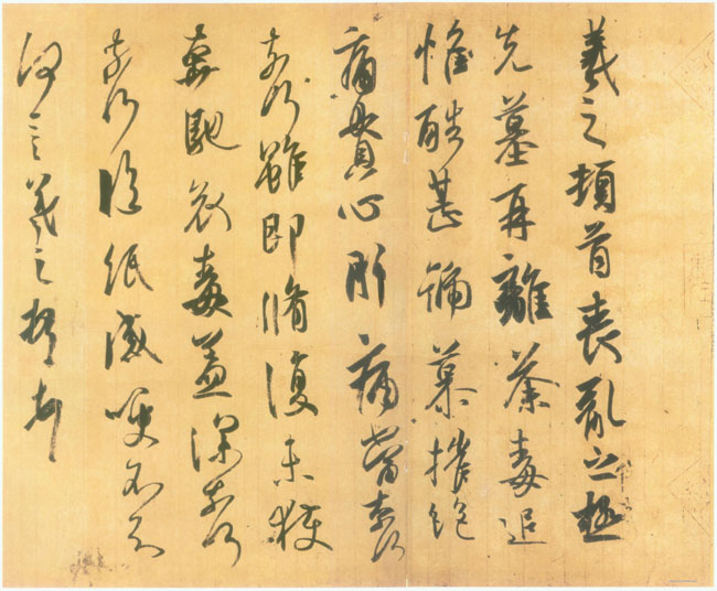 《丧乱帖》面目近于《频有哀祸帖》,然转折更为圆活流纵,字侧仄更甚,墨色枯燥相间而出,至纸末行笔更为快疾。可以想见作者当时啜泣难止、极度悲痛之情状。