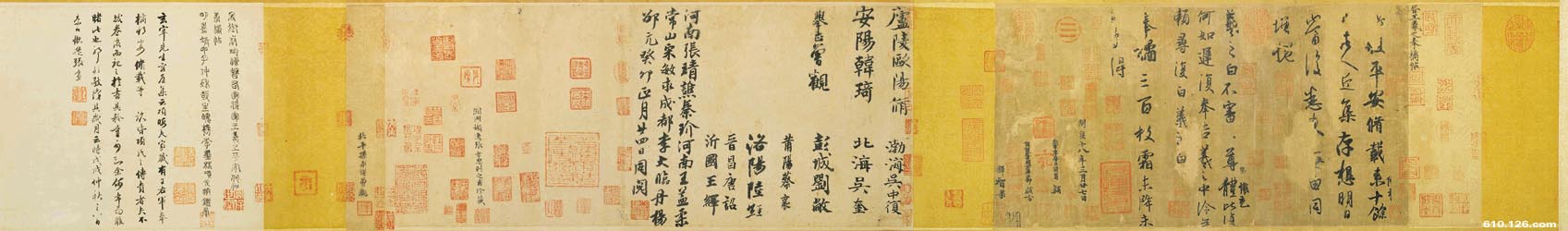 从六世纪南朝时期以来,歷代帝王都喜好收藏王羲之等名家的信札,当时将零散的书蹟裱背成一定长度的手卷,后来辗转流传,遭割裂重装,已不復原貌。这卷书蹟是用双鉤廓填的方式,复製了三件王羲之短札。《平安帖》行书兼草书,信中提到的“脩载”,是王羲之的堂兄弟。《何如帖》行书,问候对方并告知近况。《奉橘帖》行书,赠送友人橘子并附上此信。