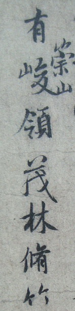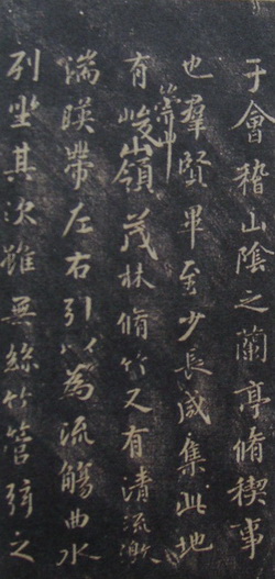 在历代难以数计的临摹和刻拓《兰亭》谱系中,有所谓的“領字从山本”一系,即《兰亭序》中“此地有崇山峻領,茂林脩竹”的“領”字写作“嶺”。在传世的冯承素、虞世南、褚遂良三大摹本(均藏北京故宫博物院),以及著名刻拓本《定武兰亭真拓本》(今藏台北故宫博物院)、《吴炳本兰亭》、《独孤本兰亭》(均藏日本东京国立博物院)等中,均为“崇山峻領”,即“領字不从山”。嶺与領非通假字,但仅在領字作山岭之义时可通假,《汉书》中“五领”即指“五岭”。《说文》中无“嶺”字。南宋巩丰《后耳目志》中有云: