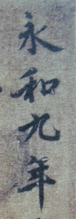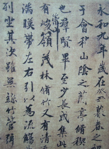 米芾在《书史》中曾写到过丞相王随(文惠)的孙子收藏有一件黄绢本《兰亭》,故米芾在题跋中言此黄绢本《兰亭》是“王文惠公故物”。其实米芾题跋是伪物,原跋刻在“游相本”《兰亭》(天干编号已失,今藏北京故宫博物院)中,此《兰亭》应是王文惠旧藏刻本。黄绢本《兰亭》拖尾的米芾题跋是从“游相本”《兰亭》临摹而来,而且“游相本”《兰亭》是“領字不从山”。“黄绢本《兰亭》”根本就不是所谓的褚遂良临本,也不是宋人王文惠旧藏本。尤其首行“永和九年”的“永”字,向左侧歪斜失态,应属“败笔”无疑。