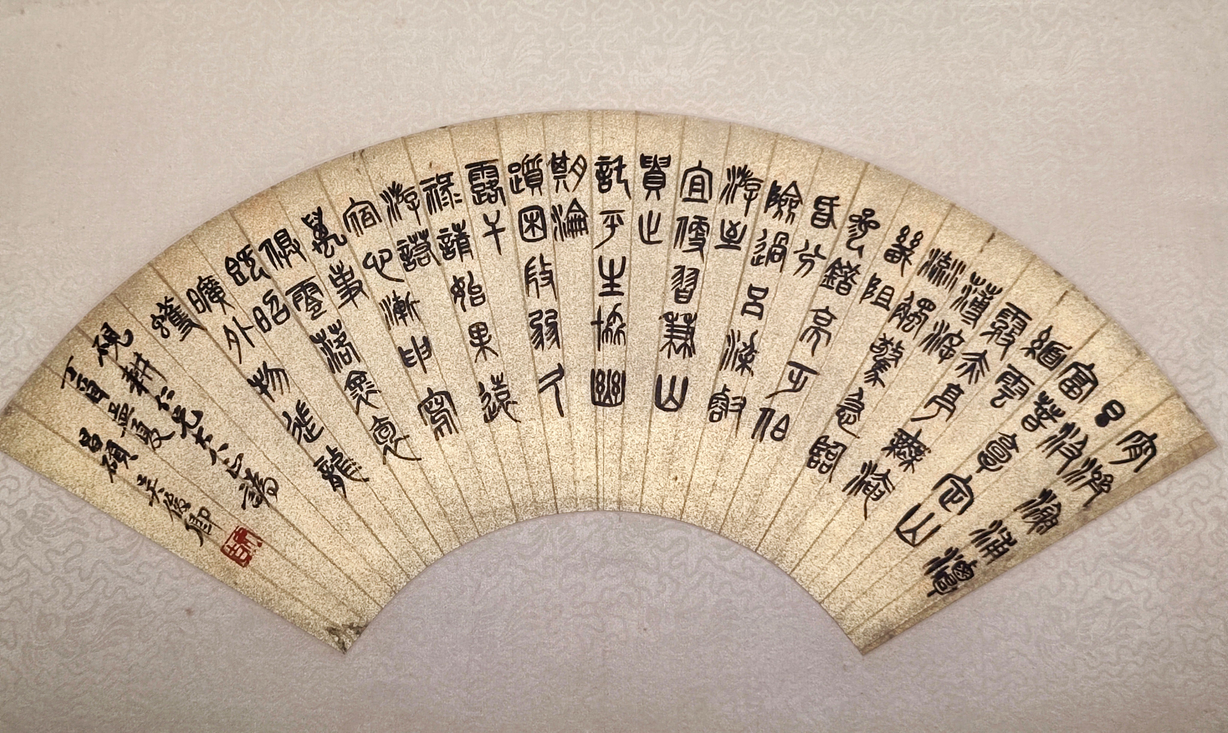 该扇页用笔瘦劲,以圆驭方,结字平正,即使有很多繁密笔画,作者仍然能够从容应对,章法规整,疏密分明。其篆书笔法精湛,运用金石之美,形成自己独特的艺术风格。