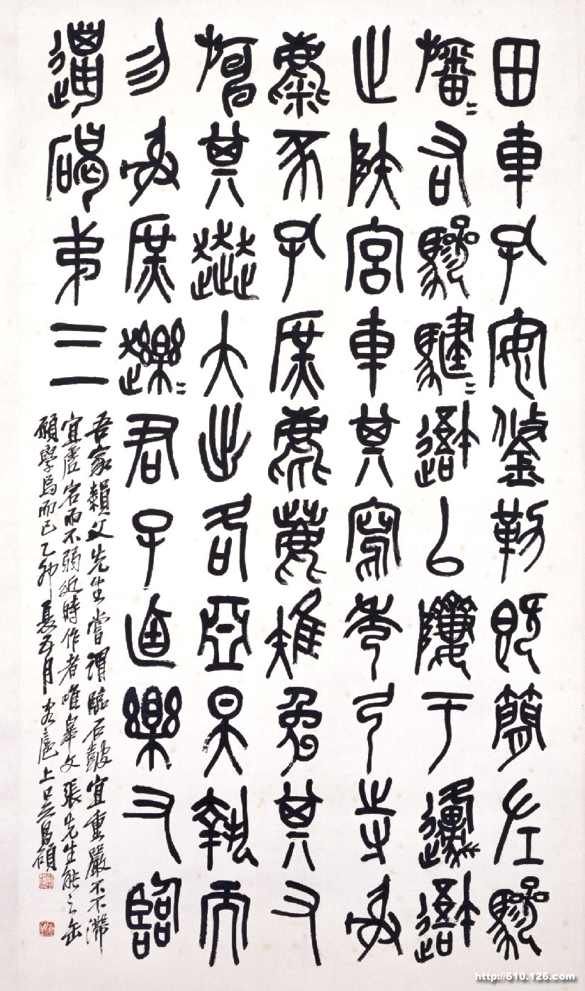 此轴笔法沉厚浑朴,笔力雄健,线条粗细富于变化,既师原文之意,得其形,又独具风骨。近人向燊评其书云:“昌硕以邓法写石鼓文,变横为纵,自成一派。”此轴结字以上下左右参差取姿,用笔遒劲,气息沉郁雄壮,自具新意。(撰稿人:马季戈)