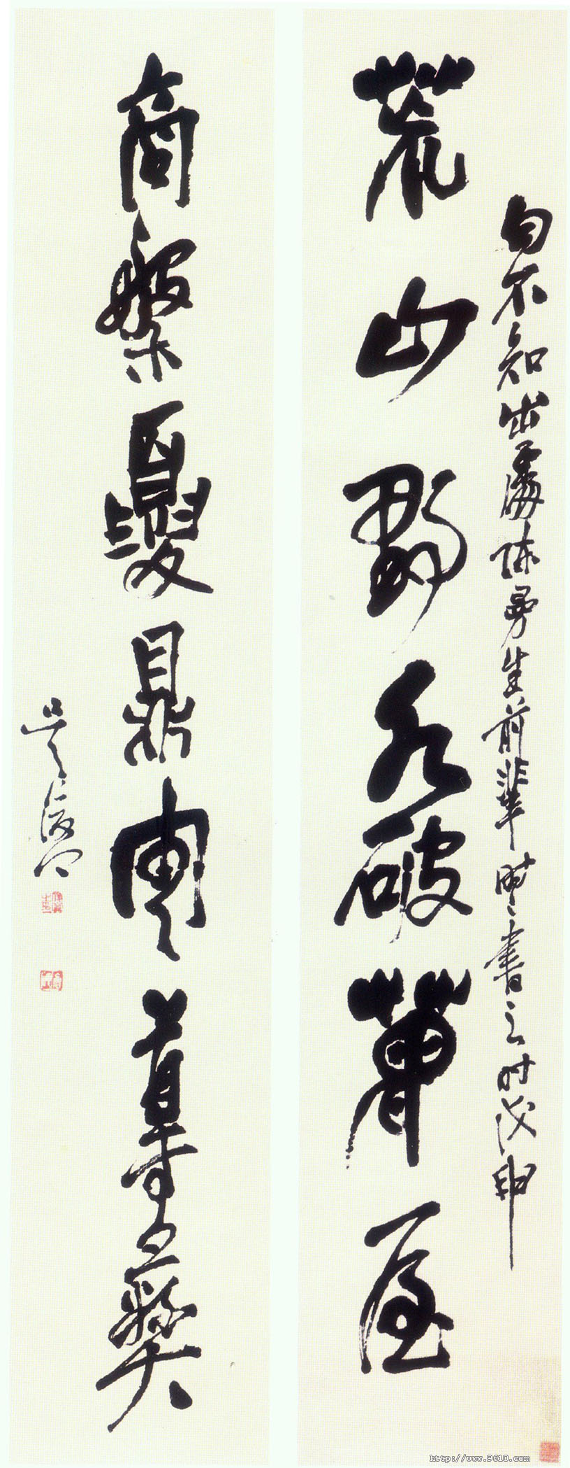 吴昌硕《行书荒山商盘七言联》 1908年 资料不详 释文:荒山野水破茅屋,商盘夏鼎周尊彝。 款署:句不知出处,陈曼生前辈时时书之。时戊申,吴俊卿