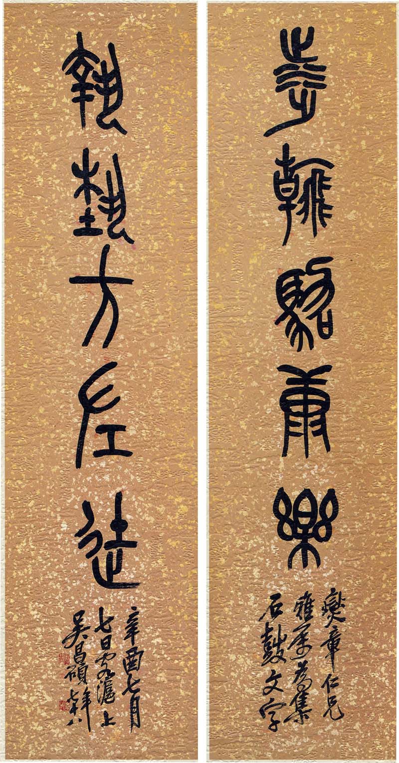 吴昌硕《篆书涉翰执艺五言联》 147.5×31.5cm×2 1921年 西泠印社藏