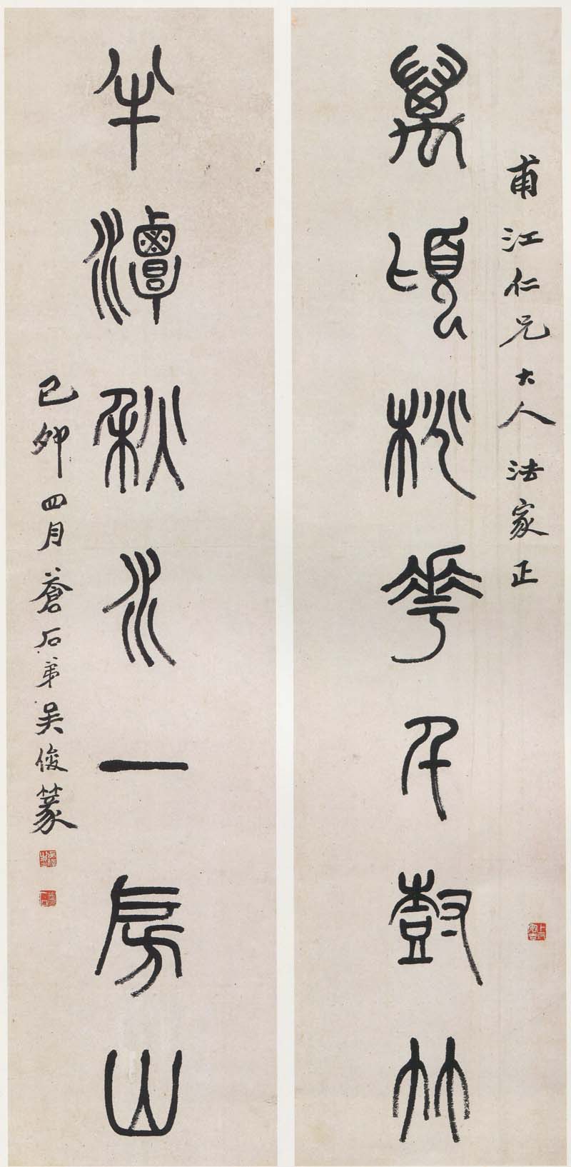 吴昌硕《篆书万顷半潭七言联》 229×30cm×2 1897年 吴昌硕纪念馆藏 释文:万顷桃花千树竹,半潭秋水一房山。 款署:甫江仁兄大人法家正。己卯四月,苍石弟吴俊篆。 钤印:吴俊之印(白文)、苍石(白文)、卜居安吉(白文)