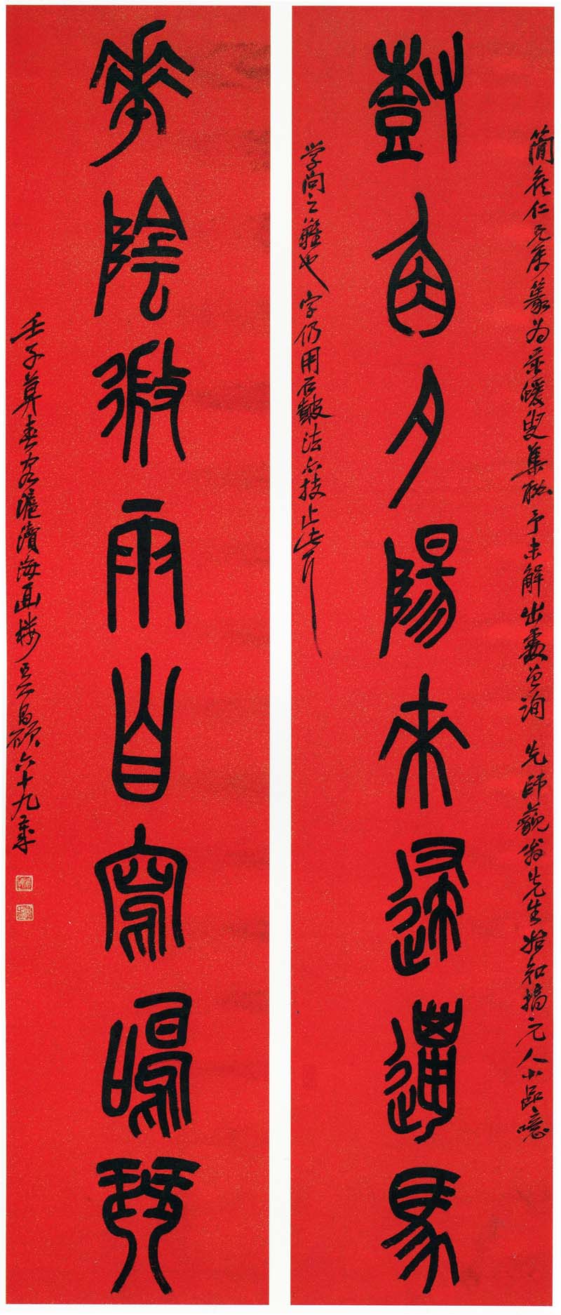 吴昌硕《篆书树角花阴八言联》 191.5×38.5cm×2 1912年 君匋艺术院藏 释文:树角夕阳来归猎马,花阴微雨自写鸣琴。 款署:简侯仁兄属篆,为录蝯叟集联,予未解出处。曾询先师藐翁先生,始知摘元人小品,!学问之难也,字仍用《石鼓》法,亦技止此耳。壬子莫(暮)春,客沪渎海函楼,吴昌硕,六十九岁。 钤印:仓硕(白文)、俊卿之印(朱文)