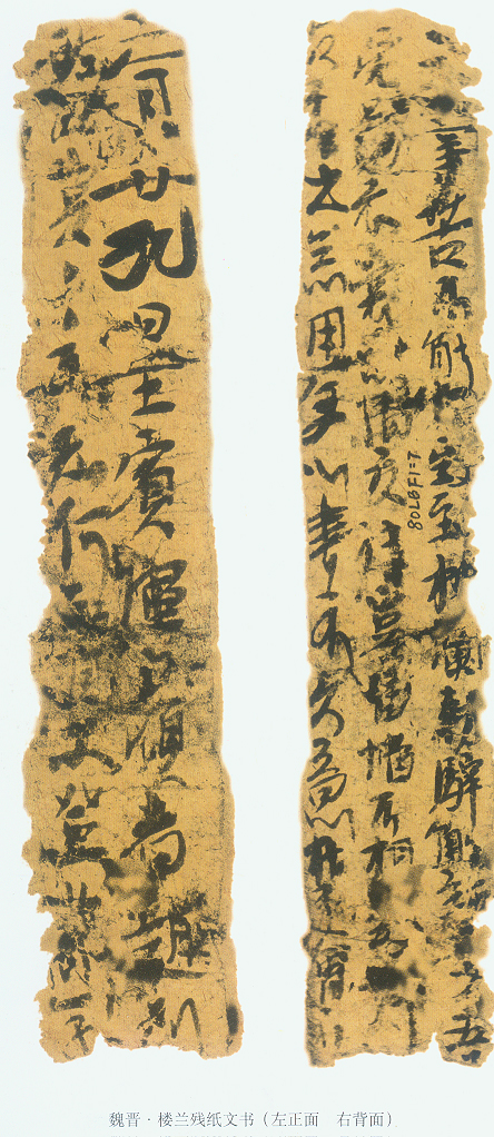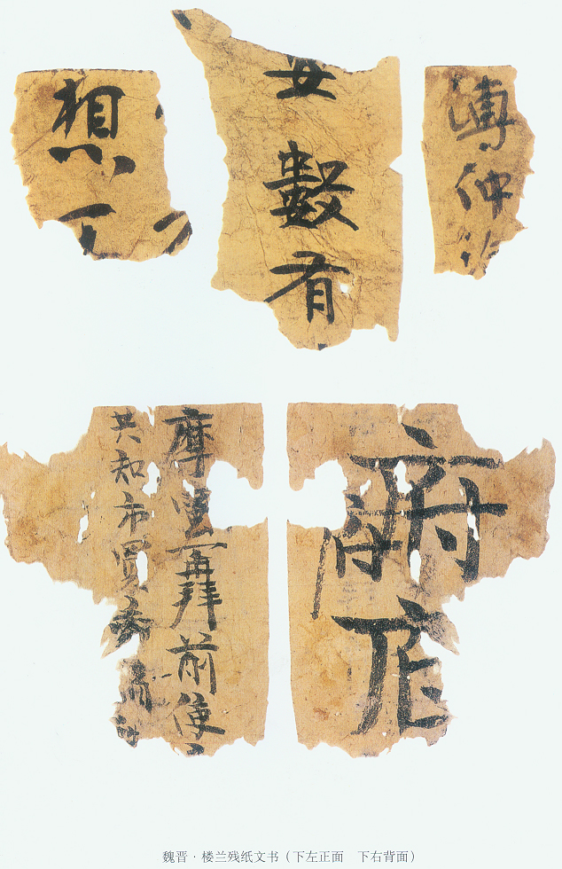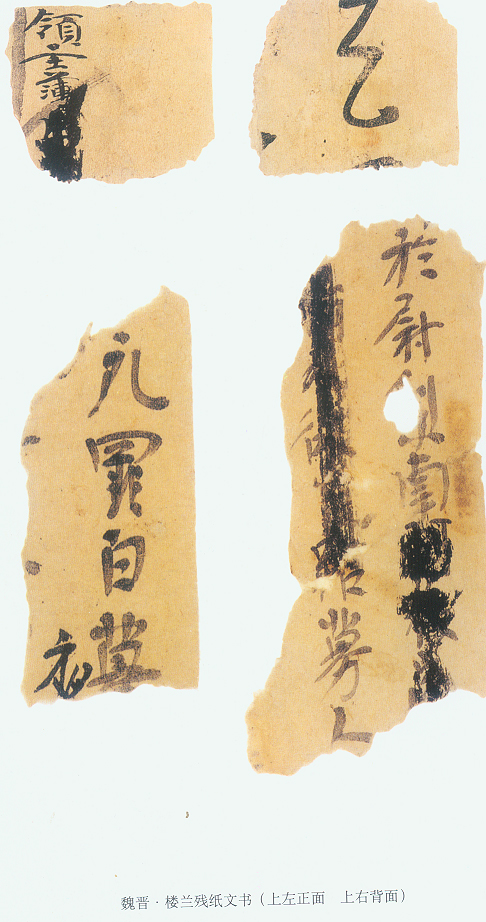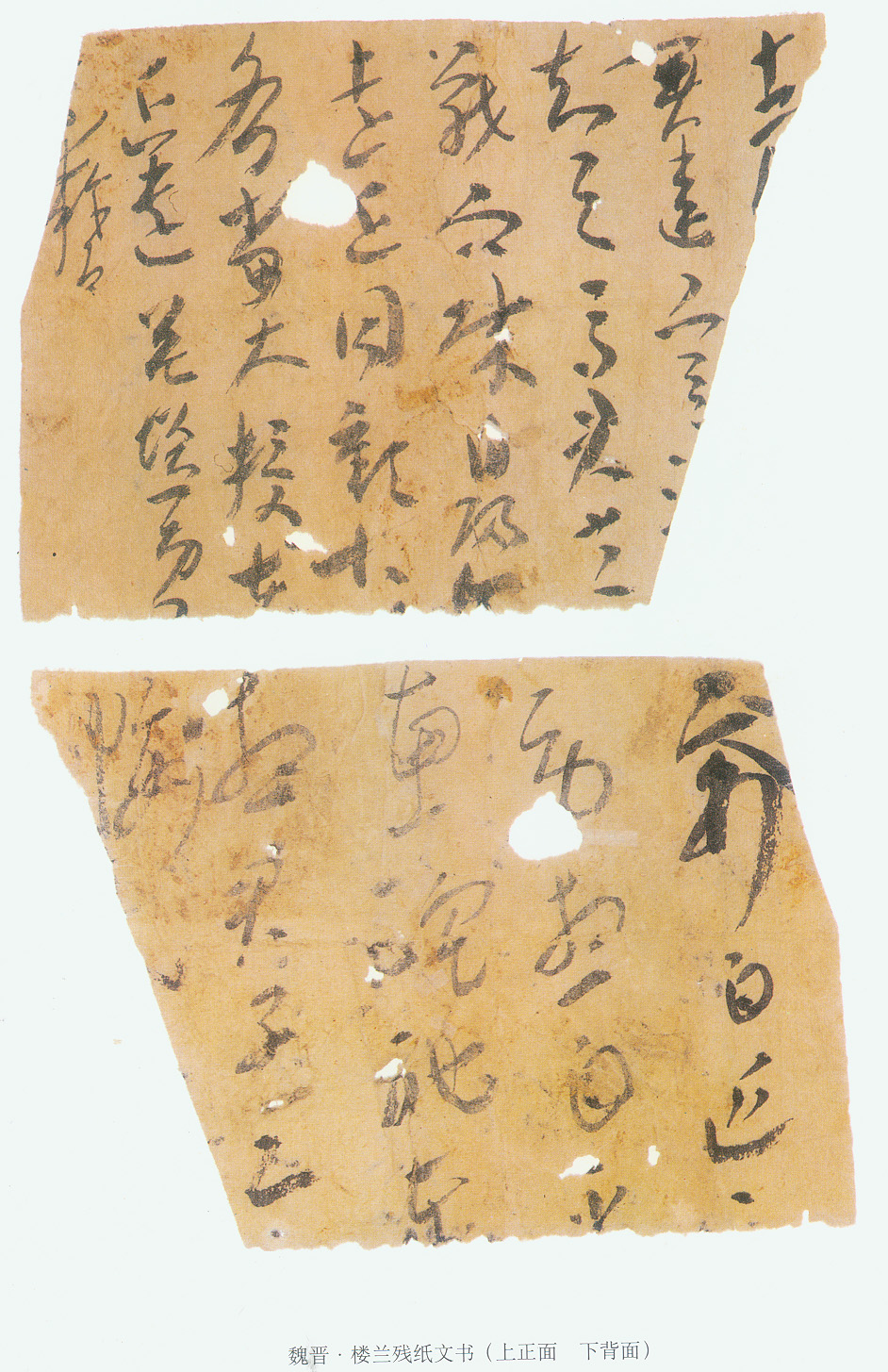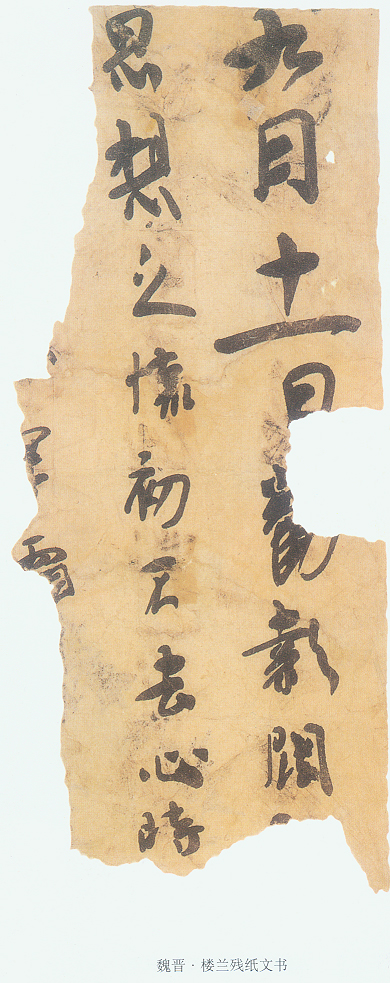 楼兰遗址发现的这些墨书的残纸和木简,残纸中有西晋永嘉元年(307)和永嘉四年的年号,这批残纸当是西晋至十六国的遗物,其内容除公文文书外,还有私人的信札和信札的草稿,书体除介乎隶楷之间的楷书外,还有行书和草书,这些残纸是研究魏、晋、十六国书法的宝贵资料,不但使我们得以窥见 晋人的真实用笔,而且为研究当时书风的演化提供了实证。