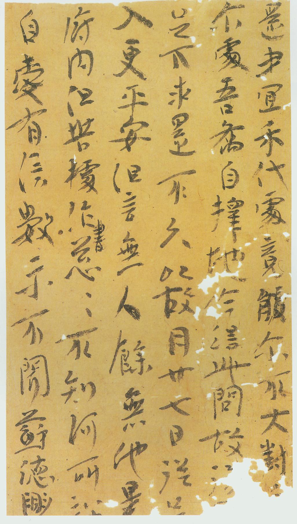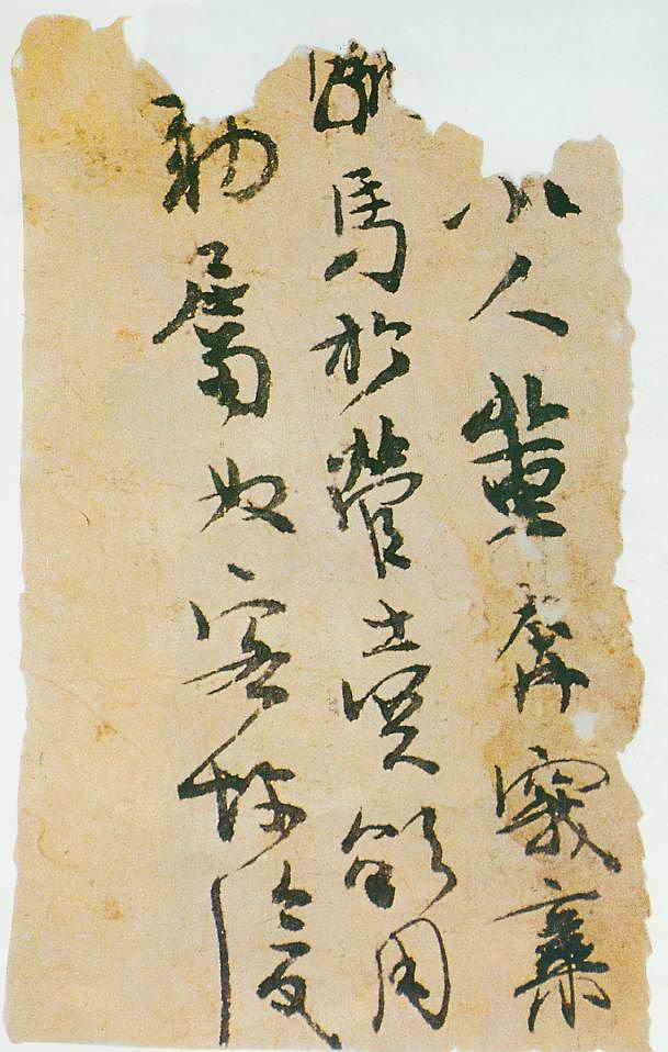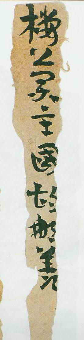 楼兰出土残纸多为西晋前后所作,且内容多为信札,书体楷、行、草俱备,为我们研究两晋书法楷行草发展状况提供最可信的资料。此件残纸即是草书信札,无论作品形式还是字体风格都与西晋索靖《七月帖》甚至王羲之《十七帖》中的草书颇为相似。信纸残断,只剩三行半。首行字似乎由于毛笔新蘸墨过于饱和故字大而笔画粗重,第二行开始笔画变细字亦变小,随之清新散逸之气飘来。仔细品味,首行字与余数行字大小、轻重迥异,然整幅作品并无突兀不协调之感,可见作者驾驭笔墨之功,这一点又与《淳化阁帖》中索靖的《七月帖》有异曲同工之妙。