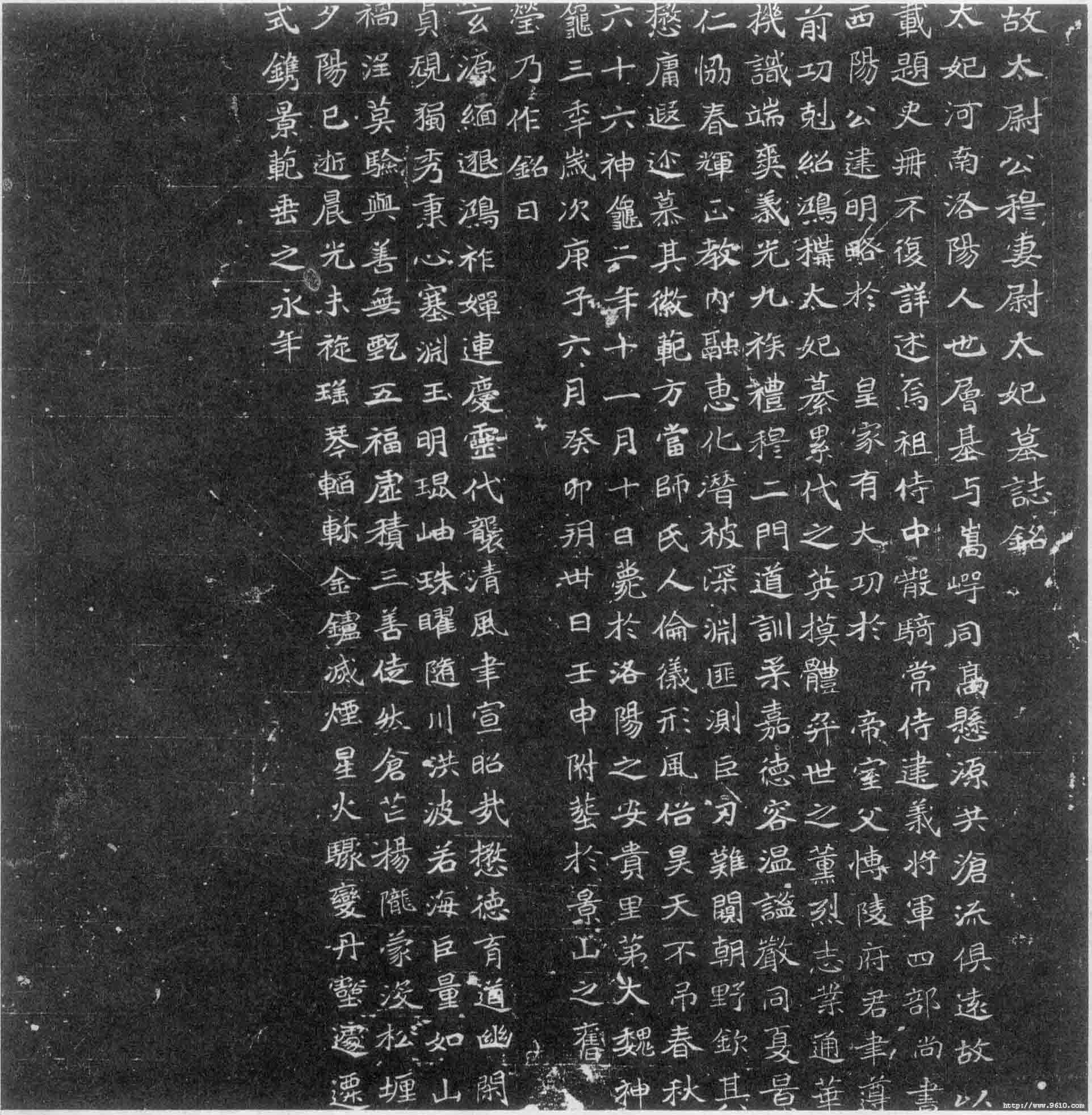《穆亮妻尉太妃墓志》,北魏景明三年(502)刻。誌石呈正方形,高宽各55厘米。誌文正书16行,行24字,字文仅占全石的三分之二,书法楷体秀劲。1925年与《穆亮墓志》同时山出于河南洛阳城东北西,1939年于右任将其捐藏西安碑林。