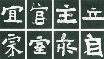(1)一点。一点情况多为起笔,其形态各有不同。如右图中“宜”字上方点画只是残存遗意,显得含蓄有致。“官”字起笔点画破空而出,取势飞动。“主”字的点画相对要厚重些。“立”字中点画形状稍长,有别于“官”、“主”二字。“宗”字点画形体更大。“室”字点画已化为短横,有磐石之稳。“亥”、“自”两字点画皆为方笔入纸,但行笔方向恰好相反。“亥”整个字形运动方向朝右,故上方点画自右向左行笔。“自”下半部分字形较为紧密,给人以密不透风的感觉,打破了原本长方的形态而变成平行四边形,整个字形有右倾趋势,点画自左向右行笔,上方下尖,显得稚拙可爱。