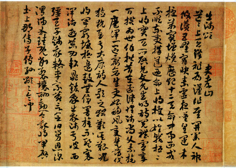 本幅无款。鉴藏印记有22方,计为:唐太平公主梵文印“三藐母驮”,唐邵王李约“约”和“邵约之印”,唐中书侍郎王涯“永存珍秘”(钤两处);宋高宗“绍”、“兴”(联珠印)、宋内府“书印”(半印)和“内府秘书之印”;明以前人之“蓑笠轩印”、“历代永宝”、“刘氏中守”、“刘完私印”、“安元忠印”及二印文不辨之印;清安岐“仪周珍藏”,清内府“乾隆御览之宝”、“石渠宝笈”、“乐寿堂鉴藏宝”、“乾隆鉴赏”、“三希堂精鉴玺”、“宜子孙”诸玺。