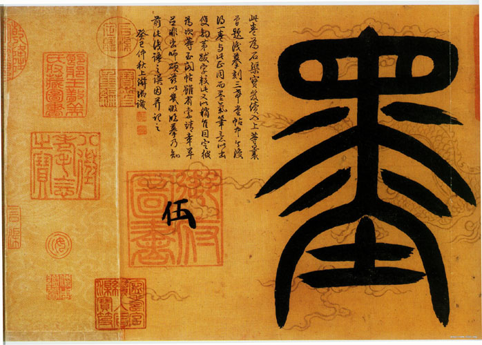引首篆书“晋墨”两字及花押“伍”,押上钤“御府图书”,据押和印,前人定为宋高宗书,实为明人仿写。另有清内府鉴藏印“太上皇帝”、“石渠定鉴”、“宝笈重编”、“宁寿宫续入石渠宝笈”。左上乾隆癸巳(三十八年,1773年)御题一段。