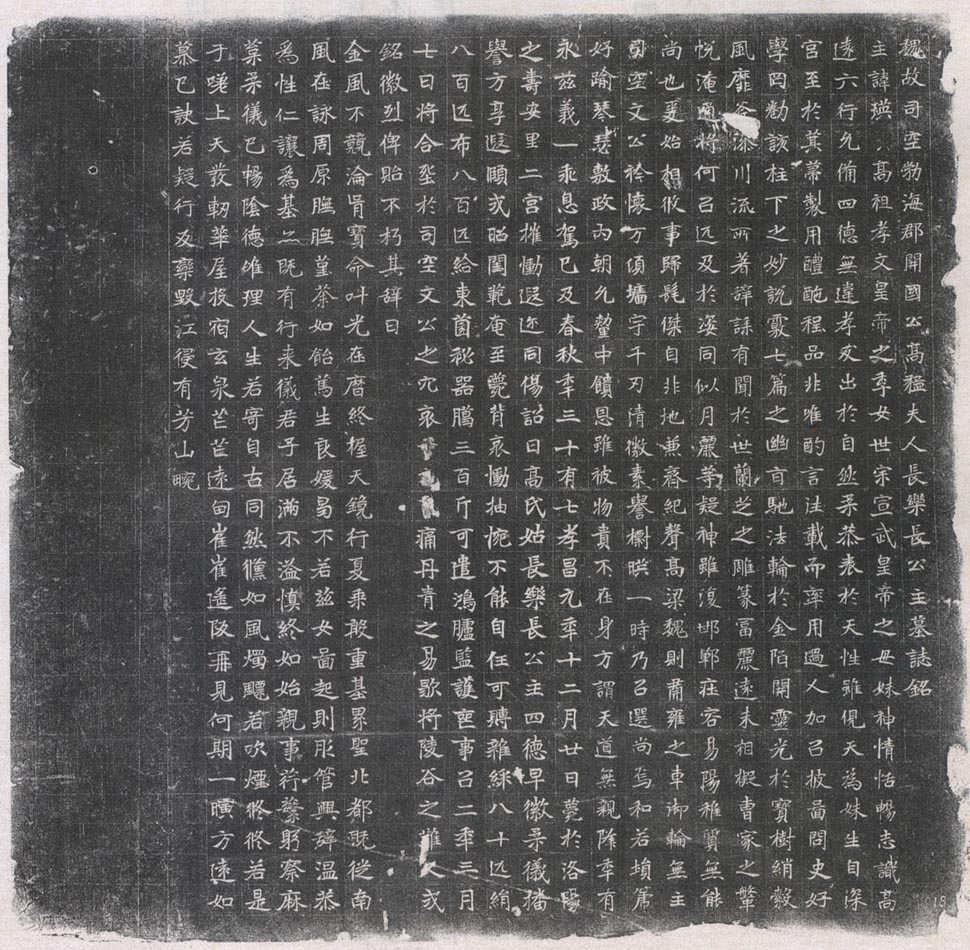 主讳瑛,高祖孝文皇帝之季女,世宗宣武皇帝之母妹。神情恬畅,志识高远。六行允备,四德无违。孝友出于自然,柔恭表自天性。虽依天为妹,生自深宫,至于箕帚制用、醴酿程品,非唯酌言注载,而率用过人。加以披图问史,好学罔倦。该柱下之妙说,核七篇之幽旨。驰法轮于金陌,开灵光于宝树。绡罗风靡,斧柯川流。所著词诔,有闻于世。兰芝之雕篆,富丽远未相拟;曹家之肇綐,淹尔将何以匹。及于姿同似月、丽等疑神,虽复邯郸庄容、易阳稚质,无能尚也。爰始相攸,事归髦杰,自非地兼齐纪、声高梁魏,则肃雍之车,御轮无主。司空文公衿怀万倾、广宇千仞,清徽素誉,标睨一时,乃以选尚焉。和若埙箎,好逾琴瑟。敷政内朝,允厘中馈。恩虽被物,贵不在身。方为天道无亲,享年有永,兹义一乖,息驾已及。春秋季三十有七,孝昌元年十二月廿日薨于洛阳之寿安里。二宫摧恸,遐迩同伤。诏曰:“高氏姑长乐长公主,四德早徽、柔仪播誉,方享遐愿,式昭懿范。奄至薨背,哀恸抽惋,不能自任。可赠杂彩八十匹、绢八百匹、布八百匹,给东苑秘器臈三百斤。可遣鸿胪监护丧事。”以二年三月七日,将合垄于司空文公之穴。哀口口口,痛丹青之易歇,将陵谷之难人。式名徽烈,俾贻不朽。