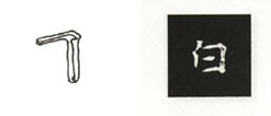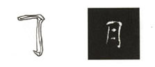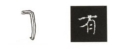 此折先写横画,收笔处提笔再直画横下,再提笔略偏左顺势中锋下行,势如弓,显得挺拔有力,与左直撇势相背,但遥相照应。