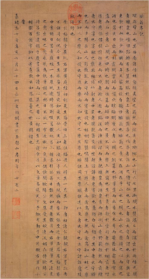 文徵明是十六世纪明代中叶苏州画坛具有重要影响力的艺术家。在鑑赏与临习古代书蹟上,他下了许多工夫,并从其中获得新的创作力量。此作精整挺秀,如世人评王羲之书“铁画银钩”者,為文徵明八十二岁(一五五一)时候的小楷书,后有长跋谈到当时书法上的体验,与书欧阳修《醉翁亭记》的原由。欧阳修从韩愈的文章得到啟发,文徵明也希望从钻研王羲之的书蹟中,追求如不食人间烟火的仙人一般,冰清玉骨的质感。