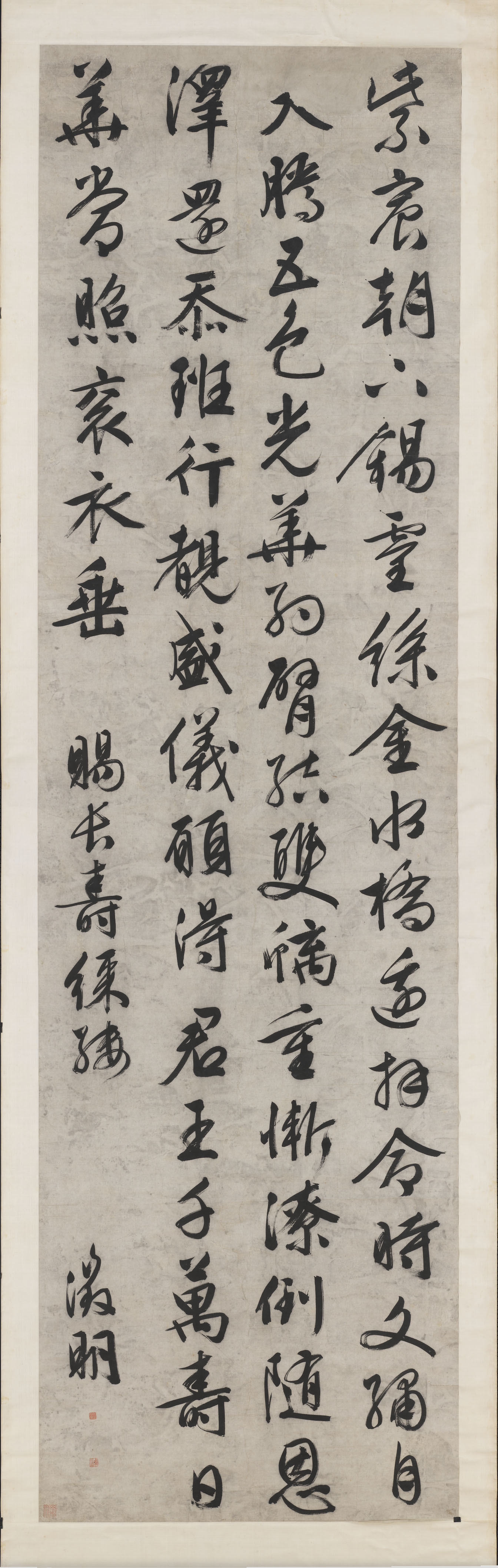 文徵明的书法初学宋元,后法晋唐,各类书体无一不精。评论者认为他的行书苍润,晚年多作山谷体,古健遒伟。这幅黄庭坚风格的行书巨轴,全文书写《奉天殿早朝》七律,全长超过三公尺,每个字大如人头,是文徵明书迹中少见的大幅作品。全作笔法放纵恣肆,富于变化,毫不造作,可见他书学涵养的深厚。