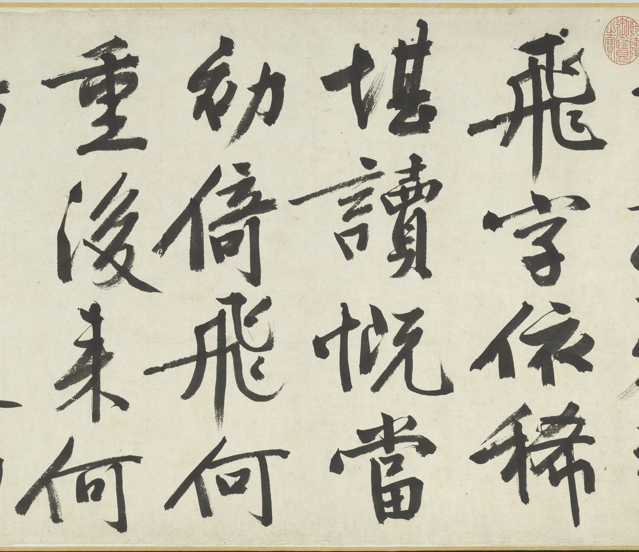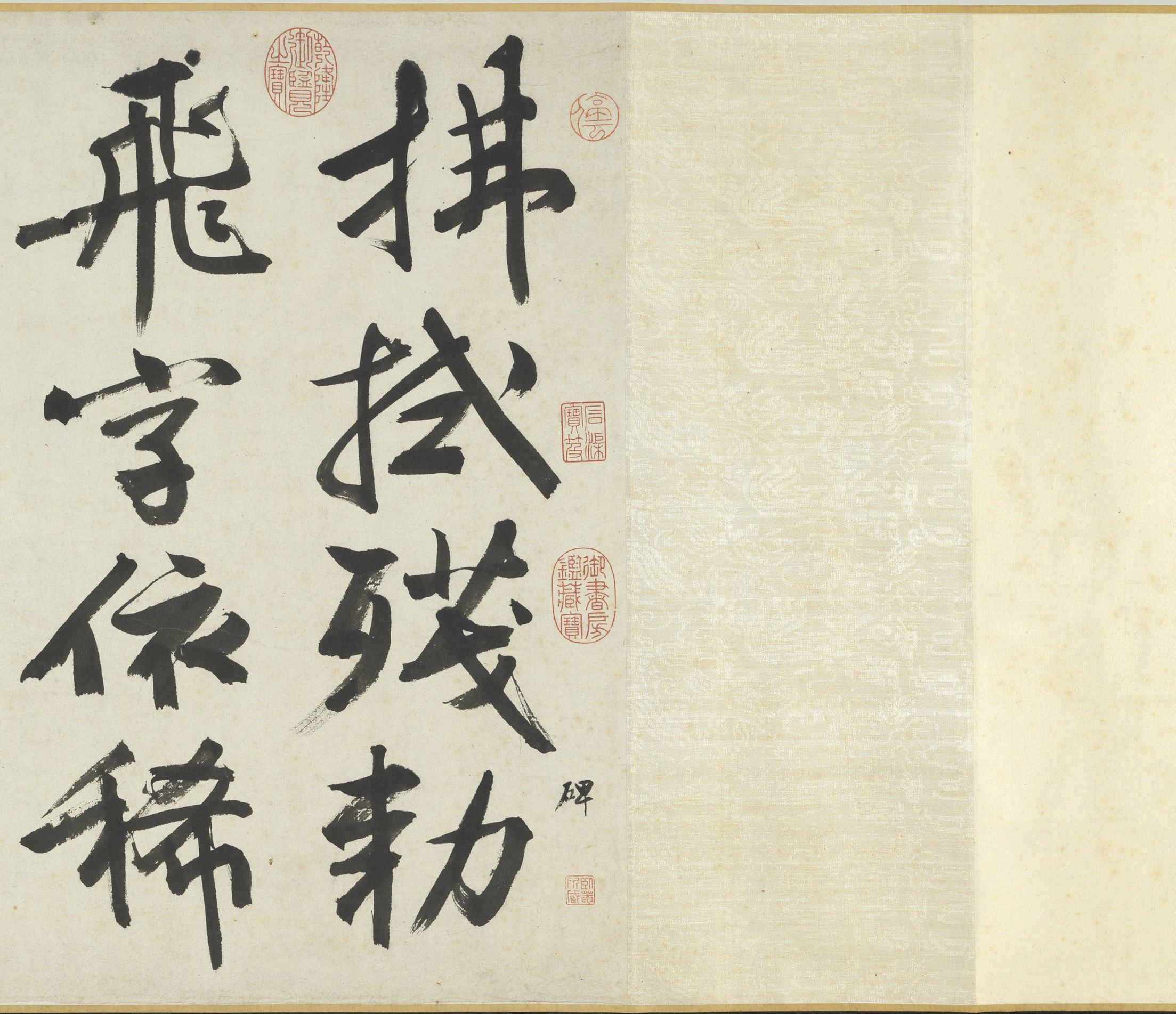 此卷文徵明为张凤翼(1527-1613)书此卷,依幅后跋文,知吴中沈氏掘地得高宗手勅石刻,文氏为此题词,薄罪秦桧而归本于高宗,可谓发千古独见之言!通篇大字行书,笔力遒劲,结字纵逸,为九十岁离世数日前所书,却毫无涣散之状。