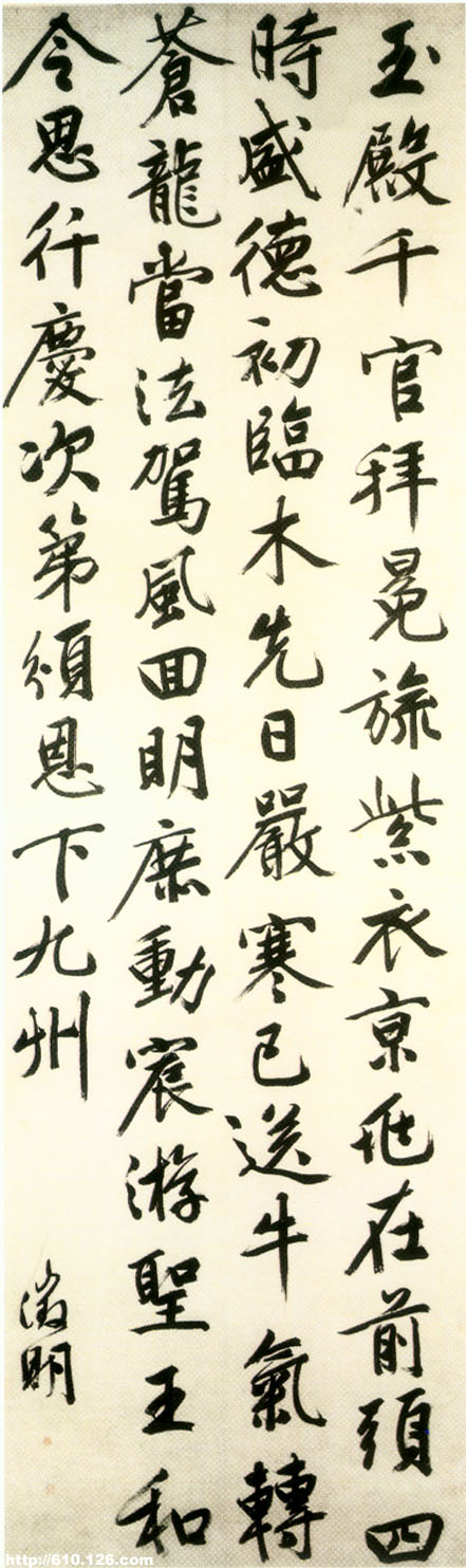 释文:玉殿千官拜冕旒,紫衣京兆在前头。四时盛德初临木,先日严寒已送牛。气转苍龙当法驾,风回明庶动宸游。圣王和令思行庆,次第颁恩下九州。 款识:徵明 钤印:文徵明印(白文)、衡山(朱文) 【资料来源】《中国书法全集》-50-文徵明卷(荣宝斋出版社 2000年9月 P37)