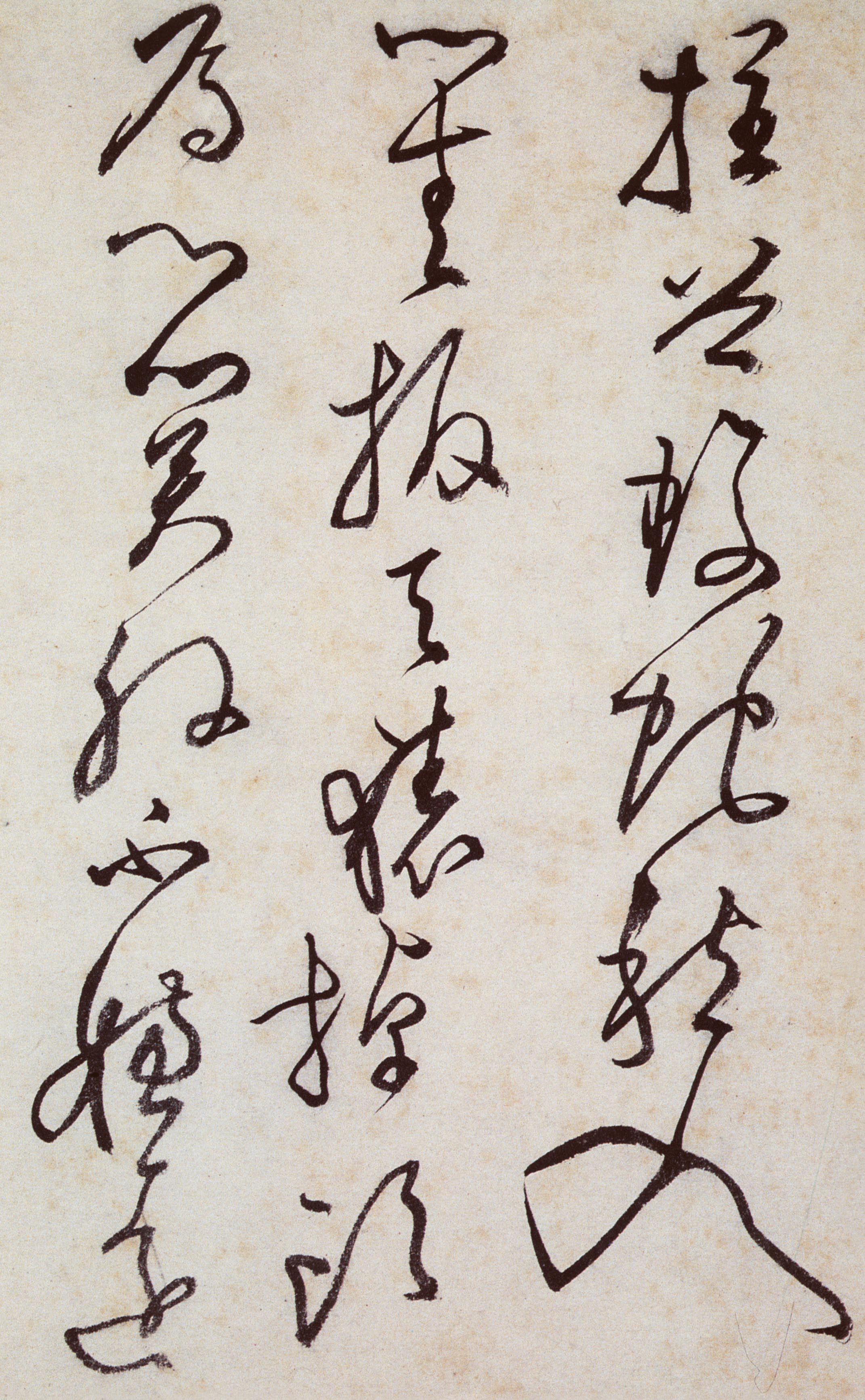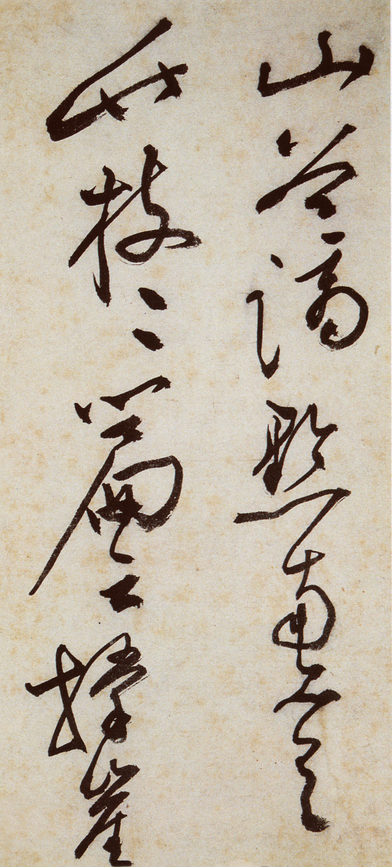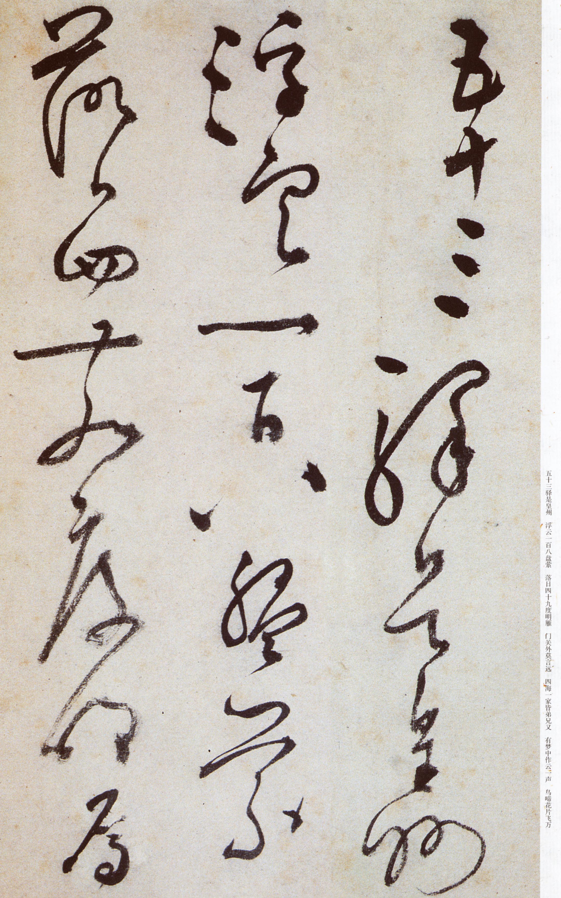 不仅如此,由于文徵明为人一向以品性端方、循规蹈矩著称,他在演绎狂草这种十分讲求书者性情的书体时,毕竟还是有些力不从心。祝允明个性放浪形骸,不乐拘检,因此所书狂草在笔法精熟的基础上有强烈的自我风格,显得风骨烂漫、天真纵逸。文徵明则不然。他的儿子文嘉在《先君行略》中曾论及其诗,云:“诗兼法唐、宋,而以温厚和平为主。或有以格律气格为论者,公不为动。为文醇雅典则,其谨严处一字不苟。”这种温厚和平、醇雅典则的天性表现到他的书法作品中,即使是狂草这样的书体形式,也都写得法度森严、中规中矩、一丝不苟。在本草书诗卷中,我们可以清楚地看到因其书写过于认真着意而导致的两个毛病。一是用笔空乏,常有败笔。清人张照《天瓶斋题跋》云:“书着意则滞,放意则滑。其神理超妙浑然天成者,落笔之际,诚所谓不及内外及中间也。待诏书不为董香光所重者,正以着处滞而放处滑。”卷中的“入”、“也”、“之”等字,出于章法的需要刻意拉长笔画,但并非意兴所至,所以线条滞涩。“也”的最后一笔,笔画僵硬,缺乏神采。“之”字的弯曲弧线亦十分生硬,与上下两字的收笔和起笔都有脱节,意气不能连贯。“一”字学山谷的横画,欲写出一波三折之妙趣,但似乎略逊力度。“啼”字的竖画也是明显的败笔,为表现虬曲不平而下笔飞动,却显得有些浮滑。他学山谷多用点,但在排列这些点时却少了一些灵性。如“三”字,上下三个点依次排下,状如算子。二是情感不足,节奏平淡。通常狂草作品因注重个性情感的抒发,随着书者情绪的波动,会有明显的节奏感。但在文徵明的这件作品中,既无墨色枯淡的节奏性的变化,亦无一张一弛的势态拉伸,全篇前后以同一个节奏同一种面貌示人,显得平淡无奇。书者既无性情的抒写,观者也自然难以有感情的共鸣。因此,文徵明的狂草虽然用笔、结字、章法都控制得相当稳定和熟练,但由于其个性的关系,毕竟缺少风格,其艺术成就是远远不及其小楷其行书的。文徵明在五十一岁写过《八月六日书事秋怀诗草书卷》后,再也不写类似的狂草大字作品,实属有自知之明。尽管如此,因徵明大草并不多见,本草书诗卷又体现了其大草作品的典型风格,故依然弥足珍贵。