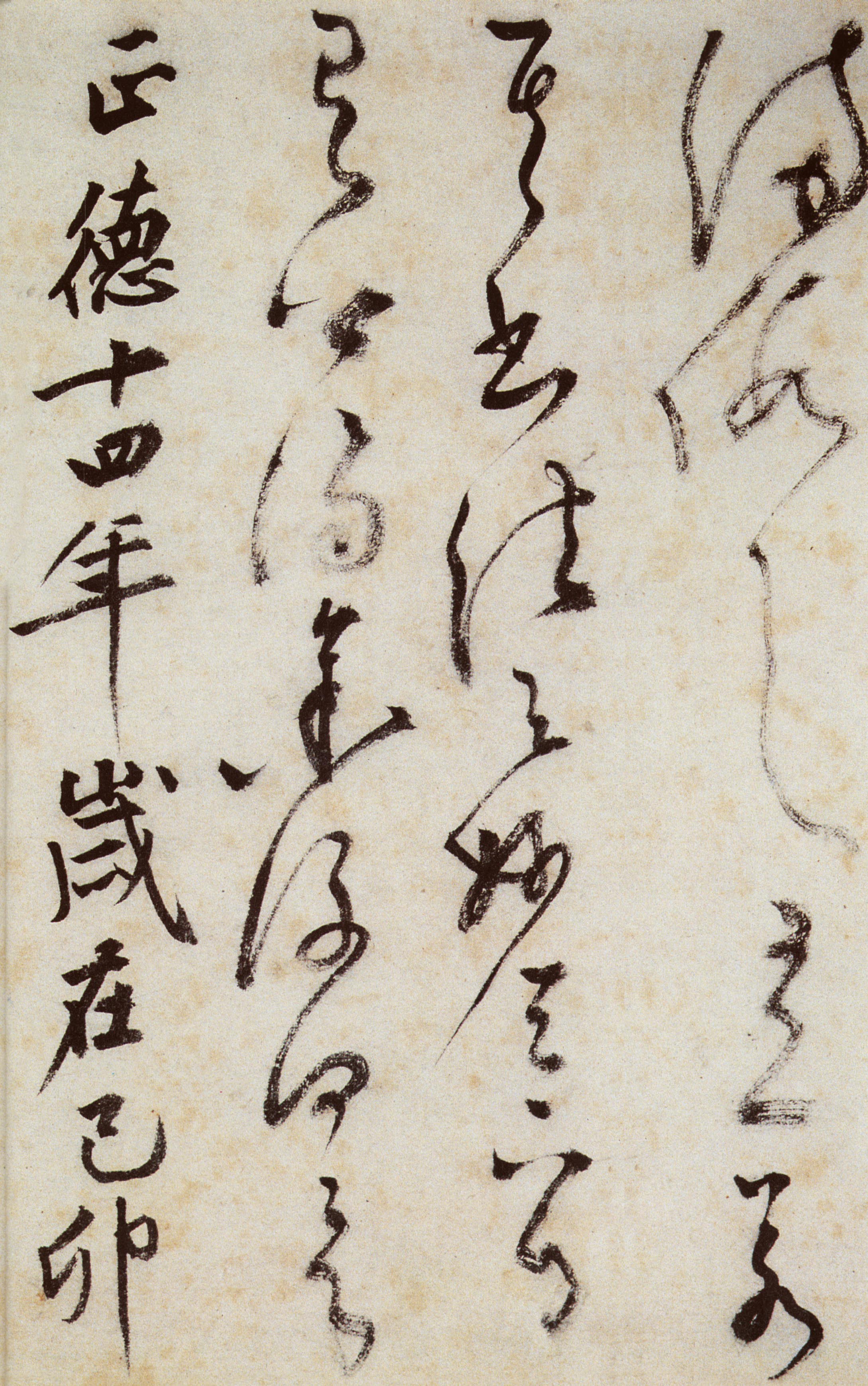 关于文徵明的草书,王世贞在《艺苑卮言》中说:“少年草师怀素,行笔仿苏、黄、米及《圣教》,晚岁取《圣教》损益之,加以苍老,遂自成家,惟绝不作草耳。”本卷狂草多用中锋,笔势曲屈环绕,线条清瘦明朗,结体疏放空灵,一片奔放流走,确有怀素草书的意味,但其笔法却全仿黄庭坚。首先,字形以欹侧取势,纵横跌宕。几乎每个字都是倾斜的,如“撑崖”的“撑”字,左边的提手旁向左倾侧得厉害,通过上面“云”字与下面“崖”字在整个列中重心的右移而达到平衡,奇险中形成参差激荡之势。卷中横画或倾侧朝下,或斜逸向上,竖画则虬曲不正,通过章法的呼应配合,形成瑰丽跌宕的韵致。其次,多见长画短点,峭劲多姿。黄庭坚的草书十分讲究作品的抒情性,因此常见夸张的长线条与强烈的点。文徵明此卷亦有明显的黄氏风格。如“竹”字,简化为一个长形折笔与两个点。“二”、“三”、“八”、“不”等字均写成点的不同排列。“入”字长撇长捺,纵逸成趣。第三,章法错落有致,雄放奇肆。有时通过列中各字重心的左右移动来实现整列的平衡,如第二列“竹枝二篇云撑崖”七字,“竹枝”二字重心左倚,以下五字则重心偏右,但通过“篇”的长撇与“撑”左部的欹侧形成呼应,整列似欹反正。也有使整列重心欹侧而形成与旁列穿插借让的情况,如第一列的明显右斜和第六列的明显左斜,形成列与列之间的布白,显得灵动多变。字形的大小变化也十分丰富,故意将笔画较少的字放大,如“入”、“也”、“之”等,既形成了纵横开阖的线条,又增加了章法中的布白,相当巧妙。卷末款署的行书就更像黄庭坚了,中宫紧敛,长笔四展,显得挺拔苍劲。