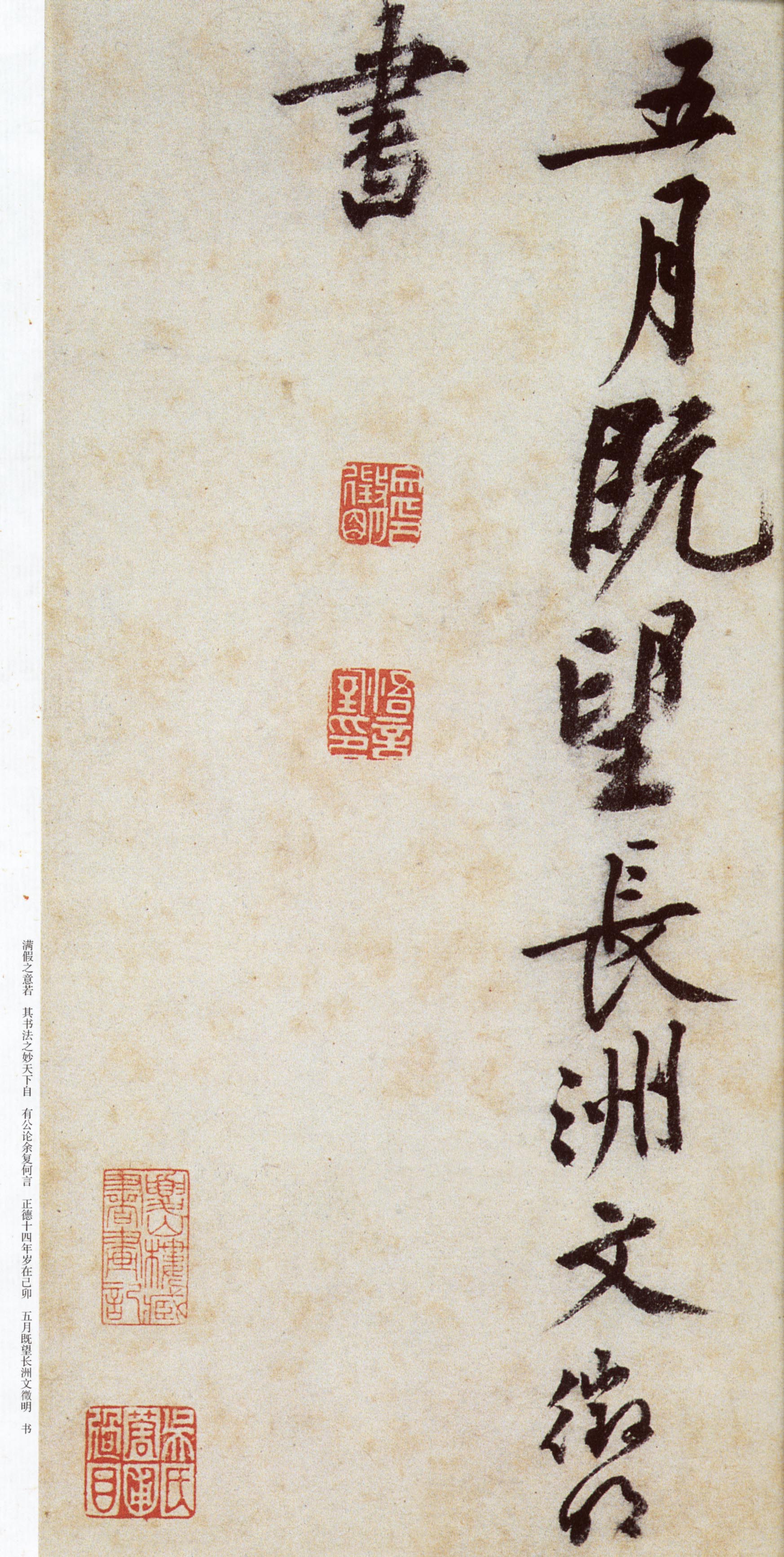 文徵明是一位各体兼善的书法家,其在世之时,书名便已倾动海内外。在他所擅长的众多书体中,尤以小楷最为人称道,且一生都用功于此,一直写到九十高龄,留传的作品自然十分丰富。他的行草书传世作品也不少,并有早、中、晚时期的不同风格,显示出完整而全面的艺术面貌。但是,其草书作品,尤其是狂草大字作品传世较少。与其他书体不同的是,文徵明写狂草并未终其一生,而仅在其生命的某个阶段。在《中国书法全集·明代文徵明卷》中,葛鸿桢先生称:“文氏四十余岁始作狂草,至五十一岁所作狂草《八月六日书事秋怀诗草书卷》已可上窥颠素,足与祝允明相颉颃了。后来文氏不再作狂草,令人深为惋惜,并不解其由。”不过文徵明在三十五岁时曾书《贾谊吊屈原赋》,全仿怀素草书,可见其始作狂草的时间比葛先生所说还要略早一些。但在其五十一岁的草书诗卷之后,确实不再见其所作的大字狂草作品了,也就是说,其创作狂草的时间不过十余年而已,所留存的传世书迹则更是少之又少。