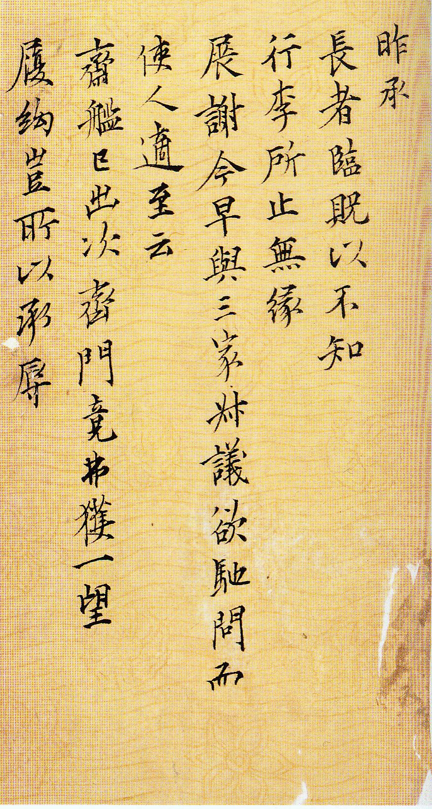 此书札因写与长辈,故字迹工整,书法端健挺拔,瘦劲精匀,流露出“险劲瘦硬、崛起削成”的欧阳询书意。文徵明22岁时从李应祯学书,所以此书又蕴涵了李应祯“入笔尖峭,锋棱外露”的笔意。如王世懋评价:“初名壁时,作小楷多偏锋,太露芒颖。”此札页是难得的一件文氏早年的书法作品。 (撰稿人:傅红展 2009年12月)