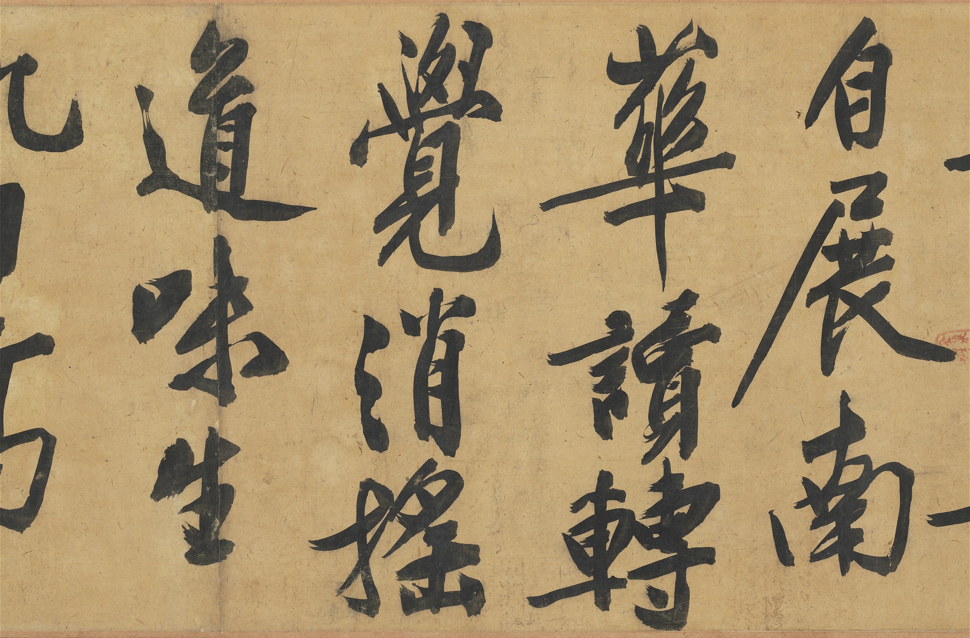 本幅以大字书写《灯花》与《焚香》等二首,凡四十八行,共一四九字,为八十一岁所作,字大如核桃,且笔画苍老,用笔劲健,气势通贯全幅,结字笔法颇得宋代黄庭坚(1045-1105)纵逸之气。灯花常指灯烛的灯芯燃烧时飞出的火花,或燃尽时所形成的花状物,传统习俗视灯花為吉祥之兆。诗中提及预知明日有喜事,或许即依据此灯花报喜的寓意。